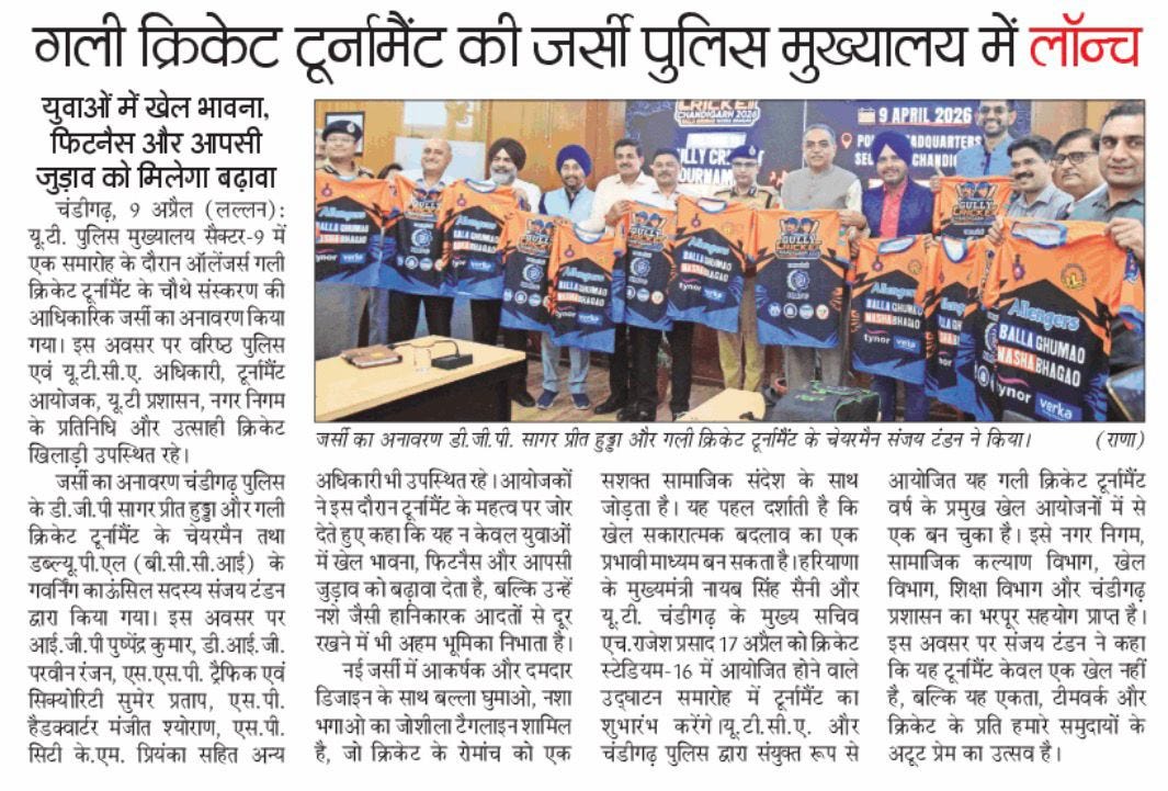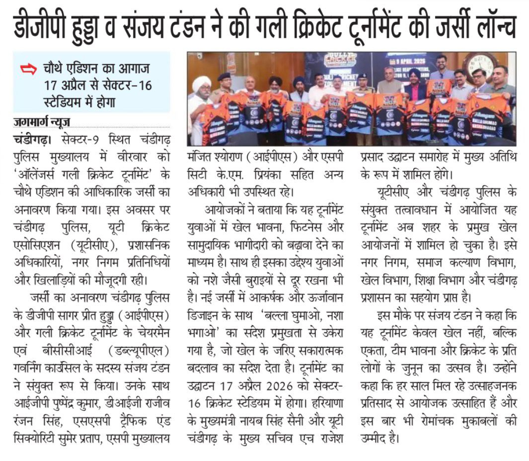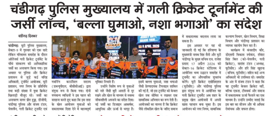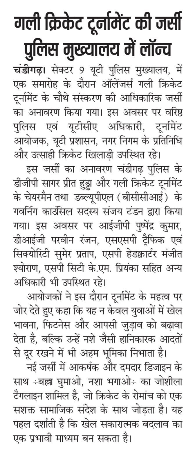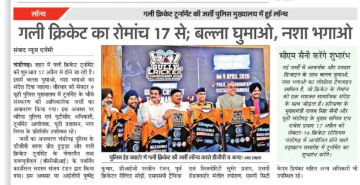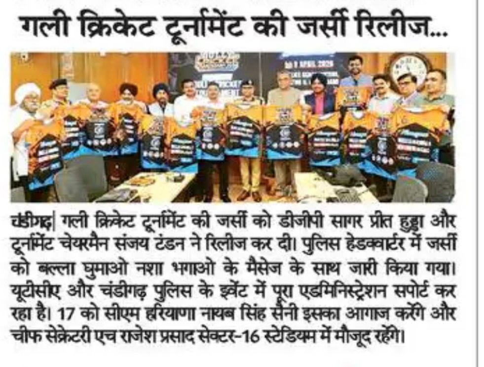 डीजीपी हुड्डा व संजय टंडन ने की गली क्रिकेट टूर्नामेंट की जर्सी लॉन्च +10 more storiesचौथे एडिशन का आगाज 17 अप्रैल से सेक्टर-16 स्टेडियम में होगाTeam Sanjay TandonApr 10, 2026SharePreviousNext