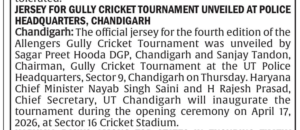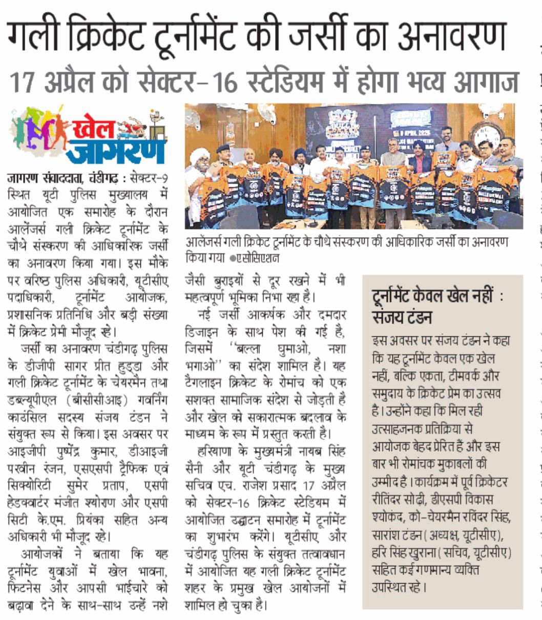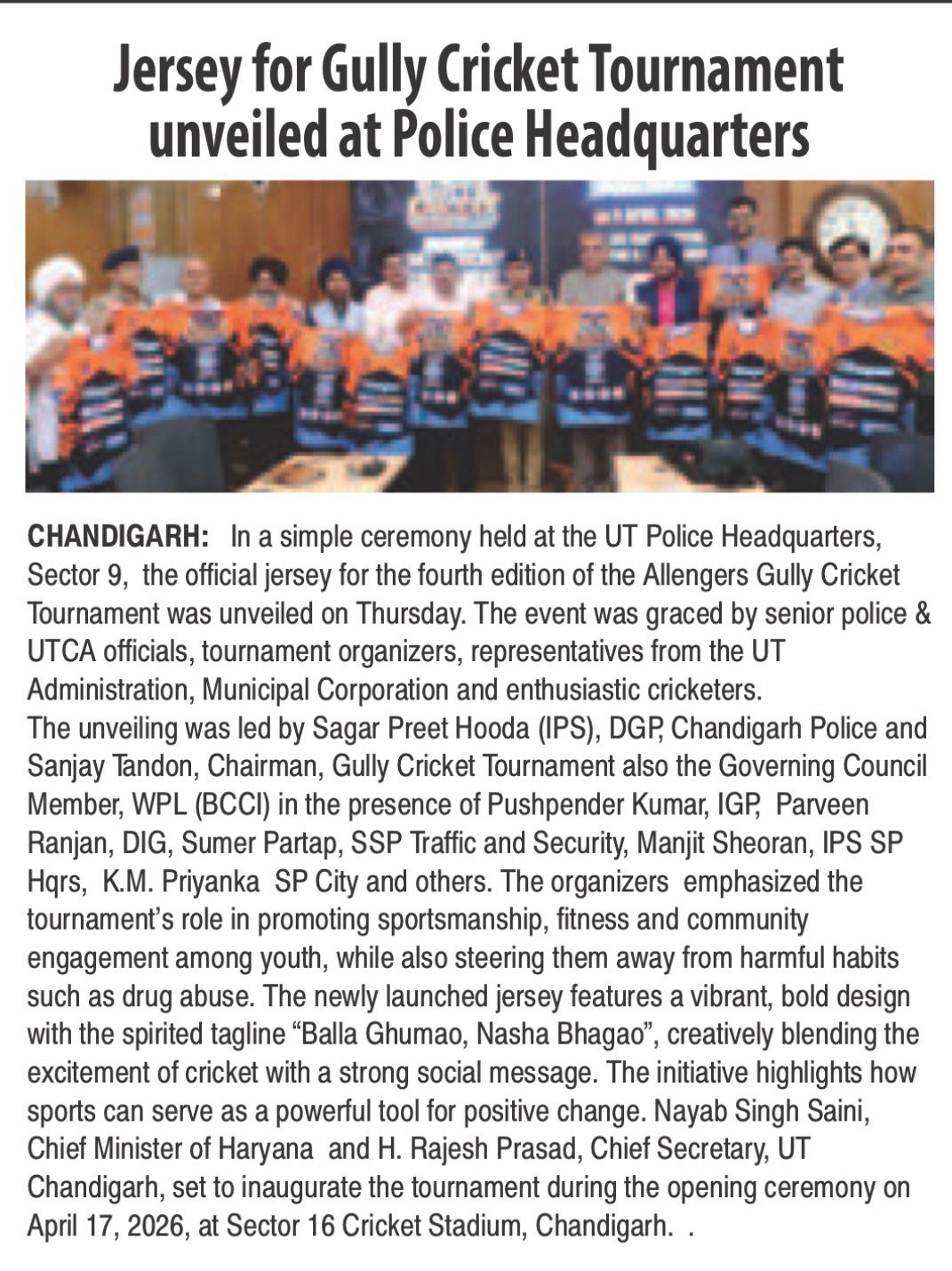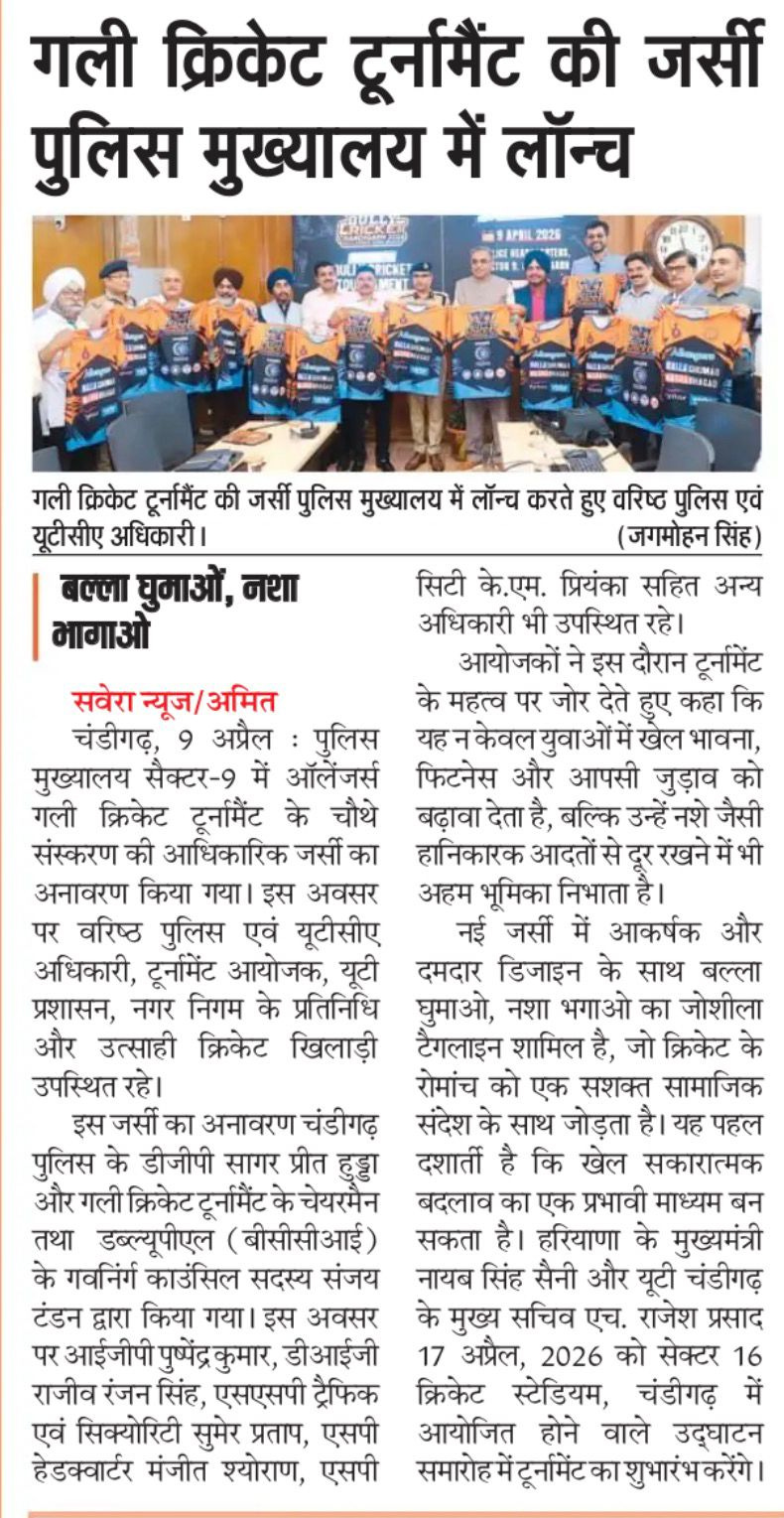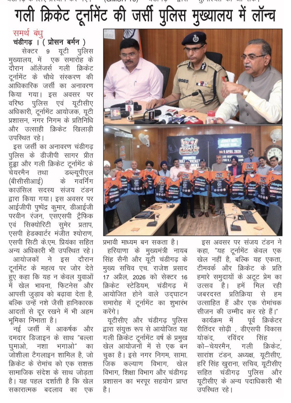 डीजीपी हुड्डा व संजय टंडन ने की गली क्रिकेट टूर्नामेंट की जर्सी लॉन्च +10 more storiesचौथे एडिशन का आगाज 17 अप्रैल से सेक्टर-16 स्टेडियम में होगाTeam Sanjay TandonApr 10, 2026SharePreviousNext