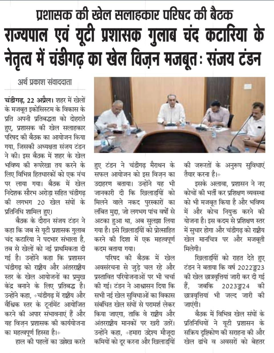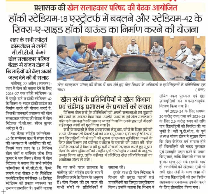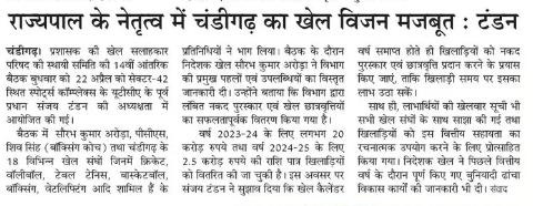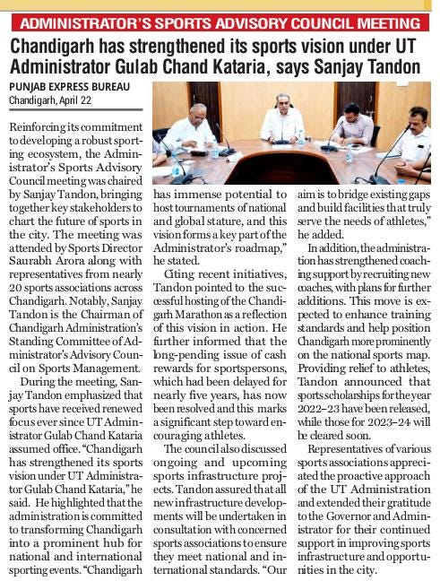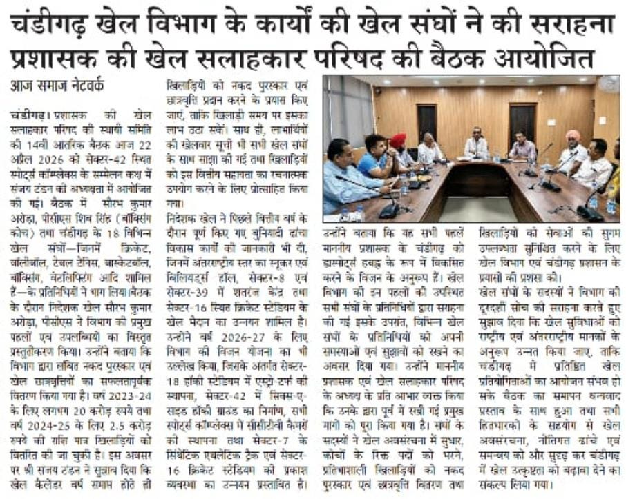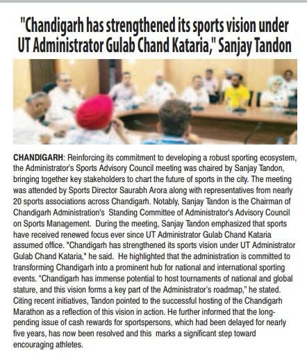 राज्यपाल एवं यूटी प्रशासक गुलाब चंद कटारिया के नेतृत्व में चंडीगढ़ का खेल विज़न मजबूत : संजय टंडन +10 more storiesप्रशासक की खेल सलाहकार परिषद की बैठकTeam Sanjay TandonApr 23, 2026SharePrevious