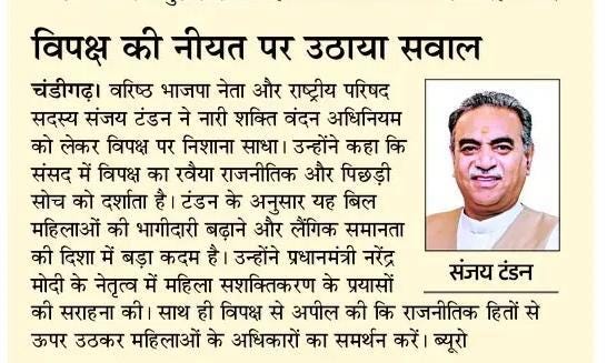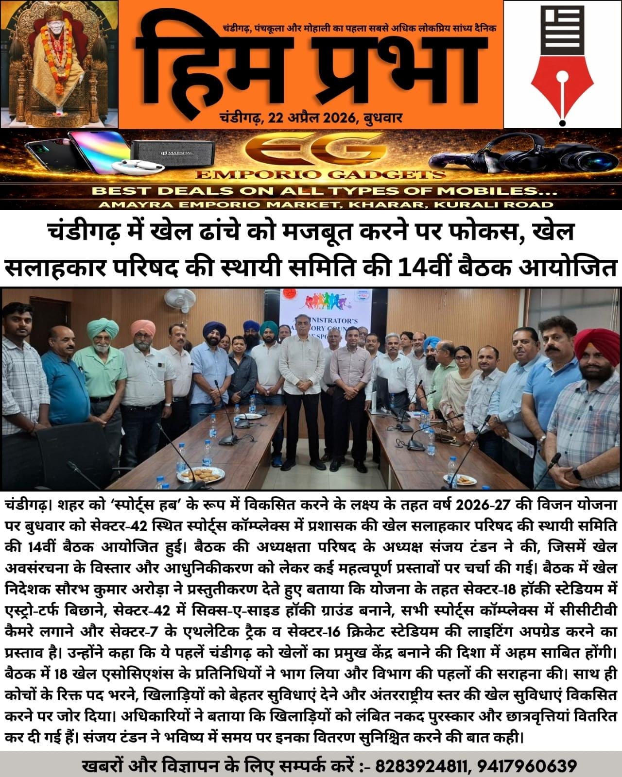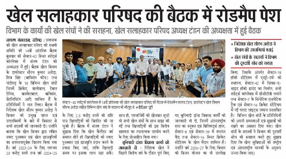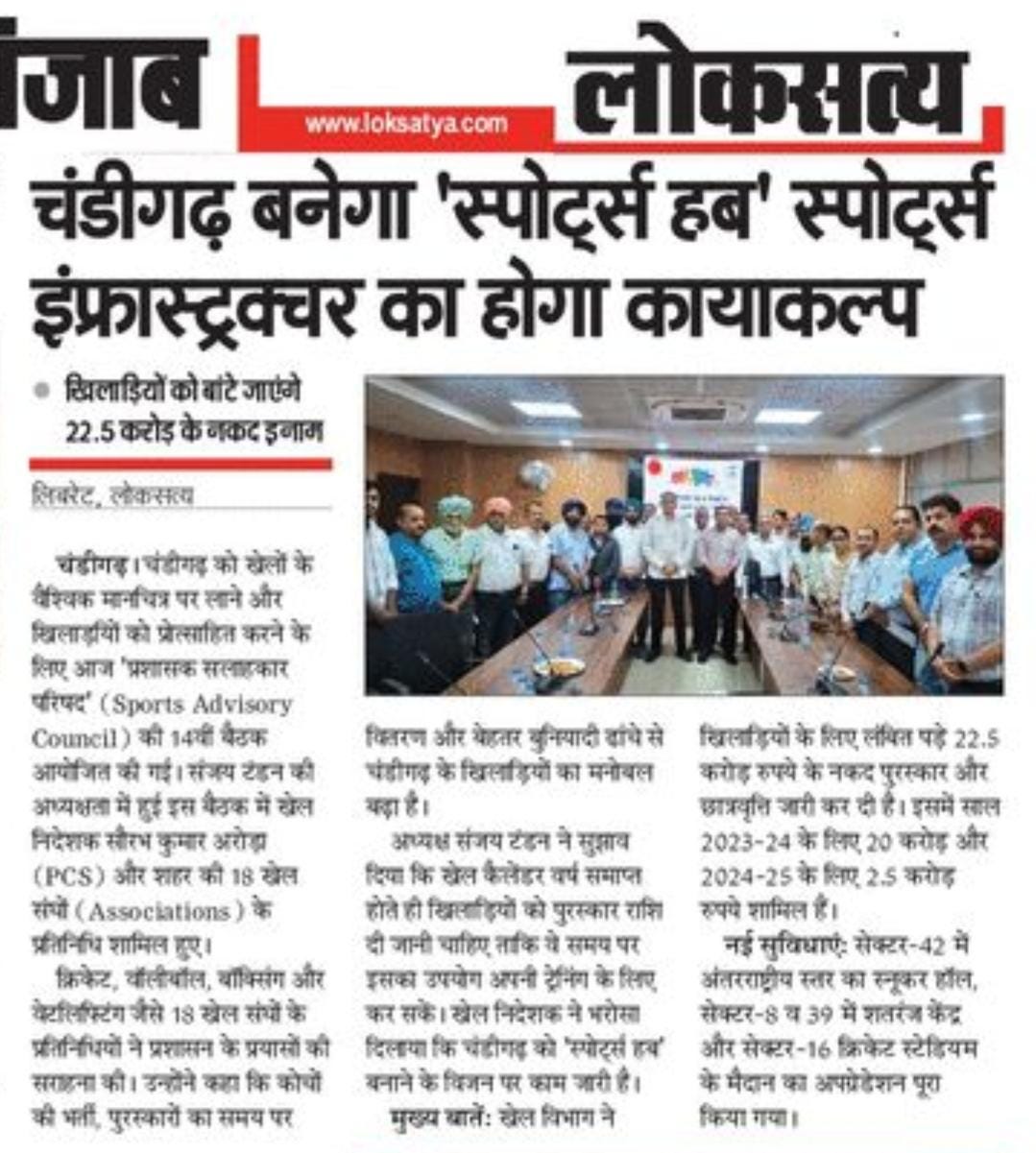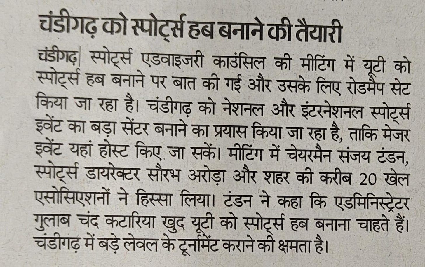 राज्यपाल एवं यूटी प्रशासक गुलाब चंद कटारिया के नेतृत्व में चंडीगढ़ का खेल विज़न मजबूत : संजय टंडन +10 more storiesप्रशासक की खेल सलाहकार परिषद की बैठकTeam Sanjay TandonApr 23, 2026SharePrevious