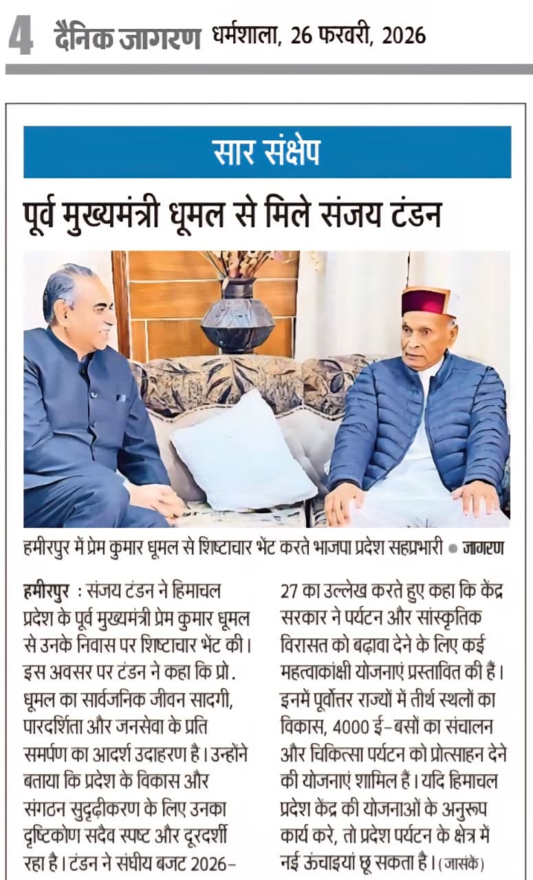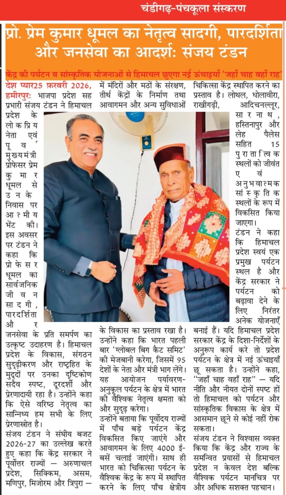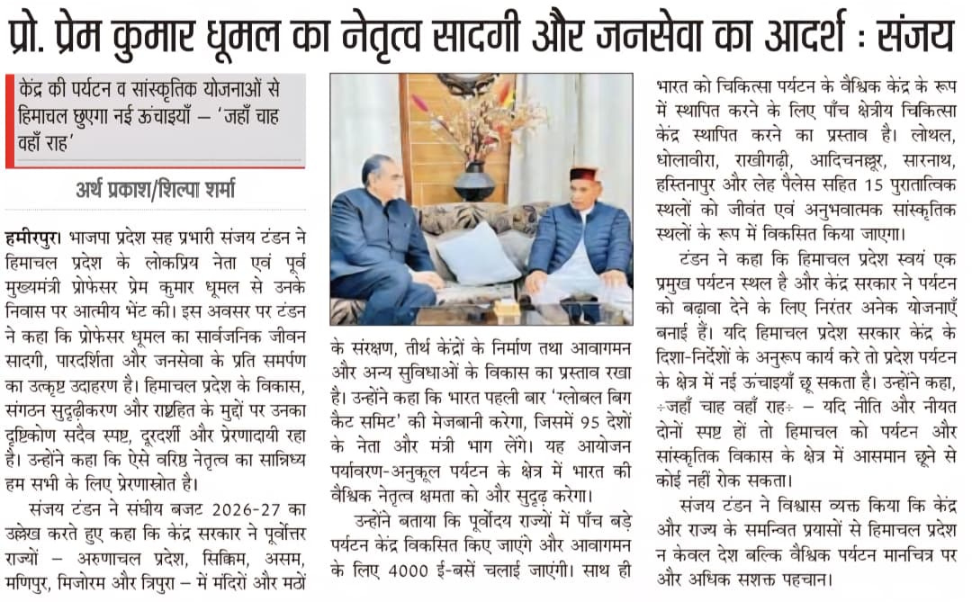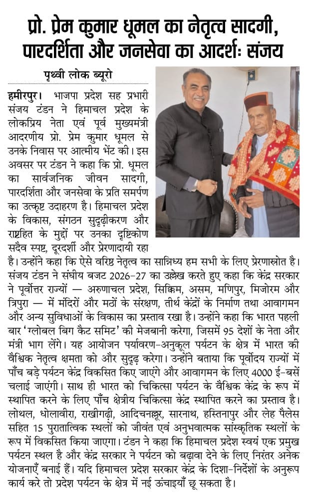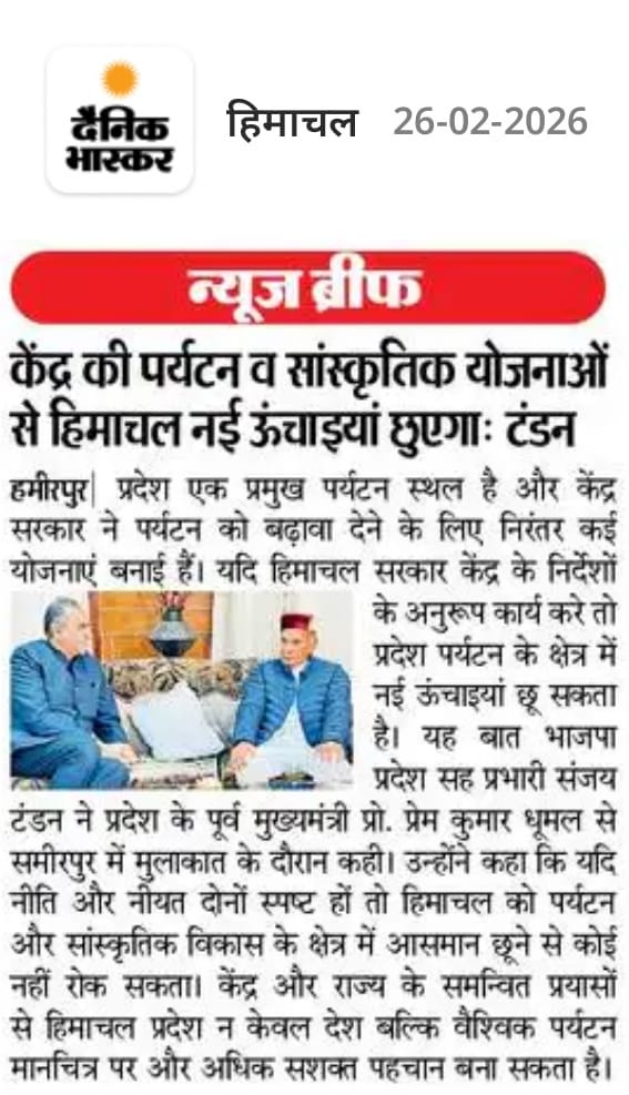 पूर्व सीएम प्रो. प्रेम कुमार धूमल का नेतृत्व सादगी, पारदर्शिता और जनसेवा का आदर्श : संजय टंडन +16 more storiesकेंद्र की पर्यटन व सांस्कृतिक योजनाओं से हिमाचल छुएगा नई ऊंचाइयाँ- 'जहाँ चाह वहाँ राह'Team Sanjay TandonFeb 26, 2026SharePreviousNext