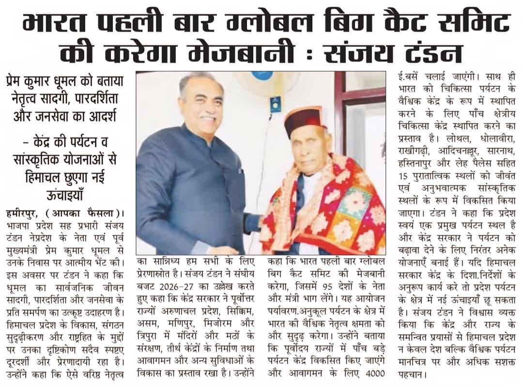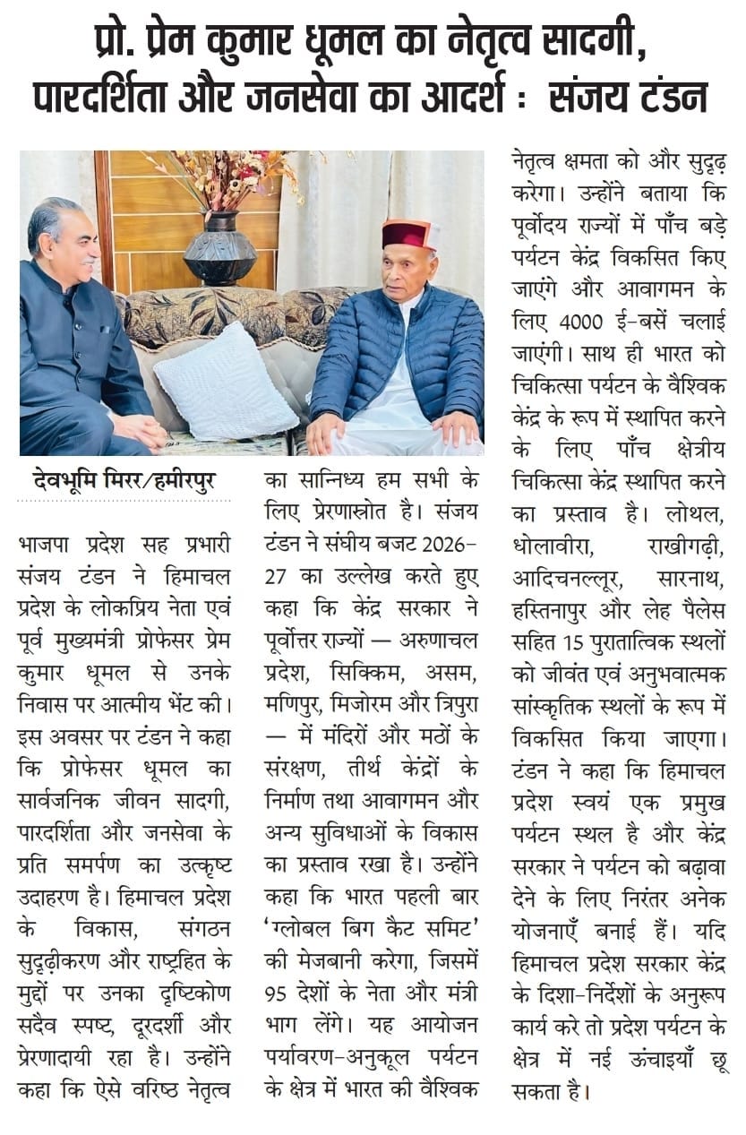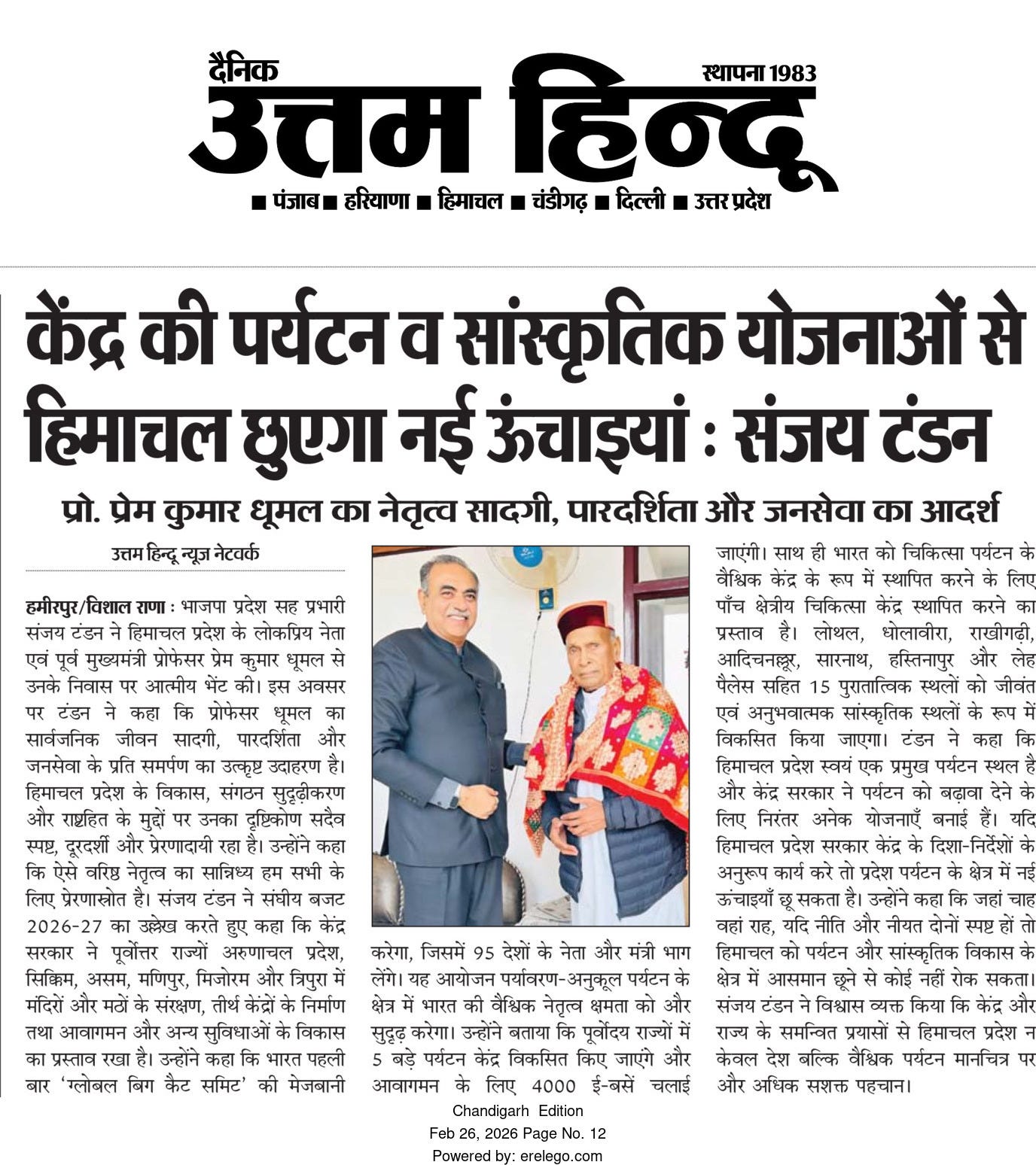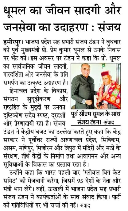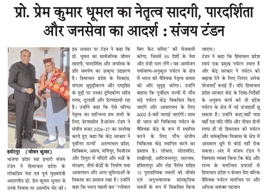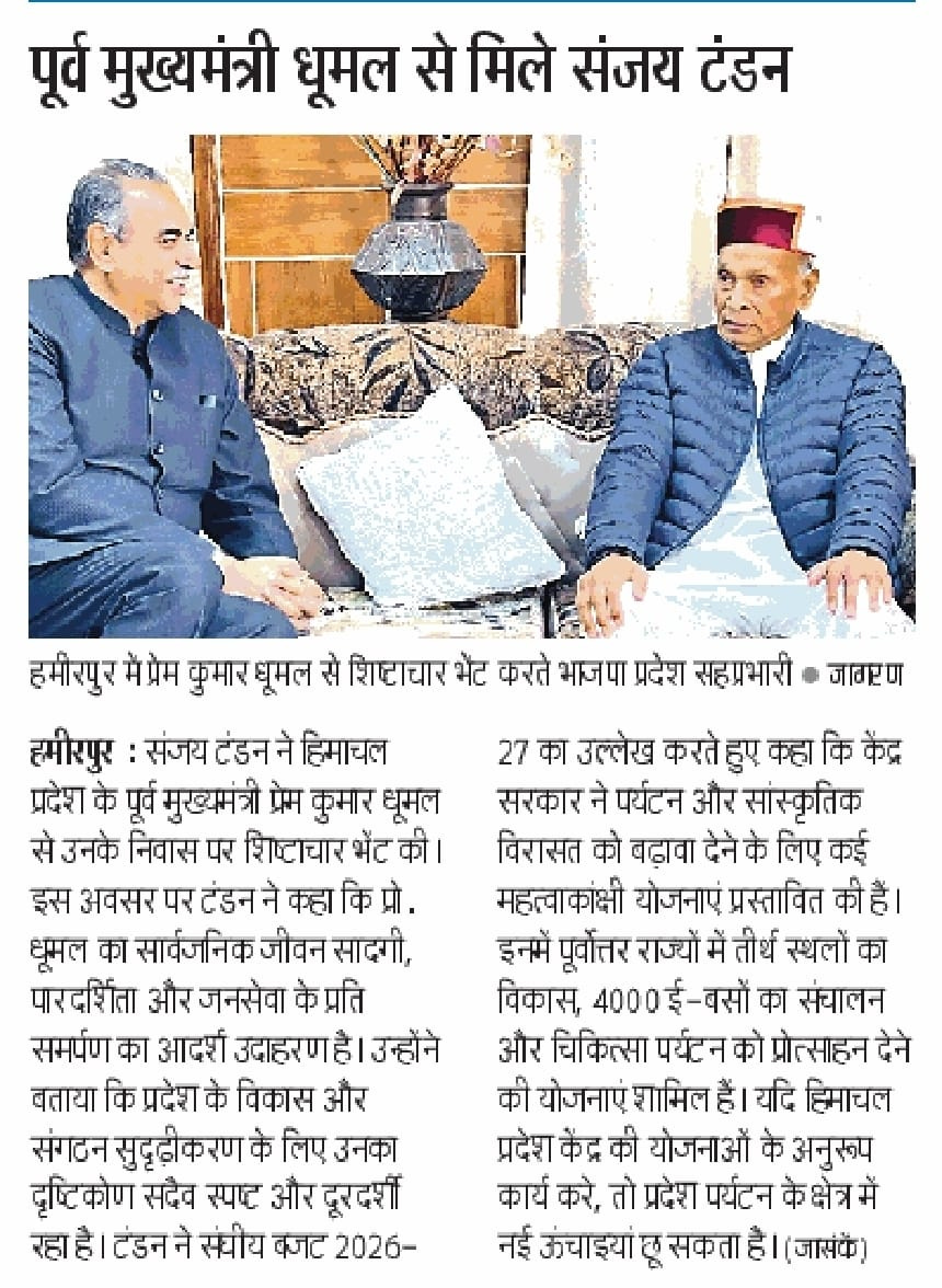 पूर्व सीएम प्रो. प्रेम कुमार धूमल का नेतृत्व सादगी, पारदर्शिता और जनसेवा का आदर्श : संजय टंडन +16 more storiesकेंद्र की पर्यटन व सांस्कृतिक योजनाओं से हिमाचल छुएगा नई ऊंचाइयाँ- 'जहाँ चाह वहाँ राह'Team Sanjay TandonFeb 26, 2026SharePreviousNext
