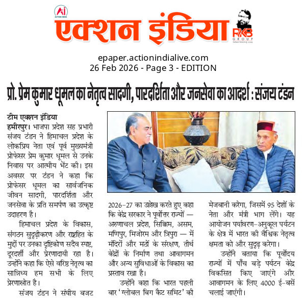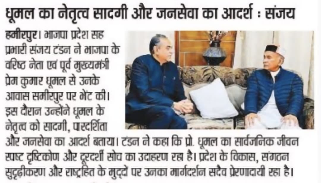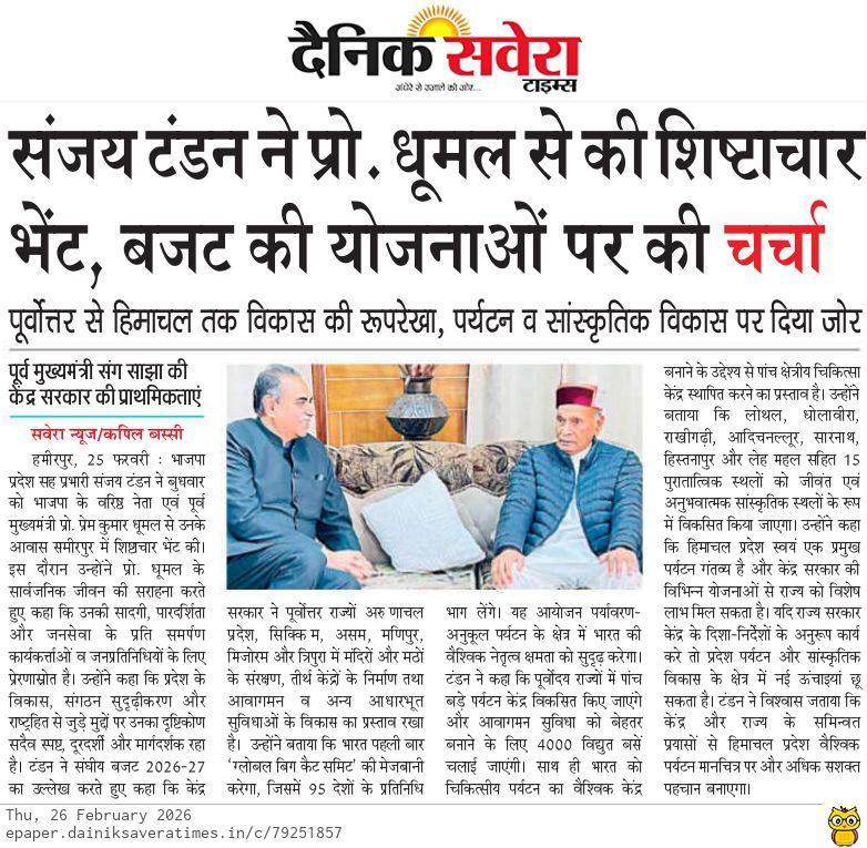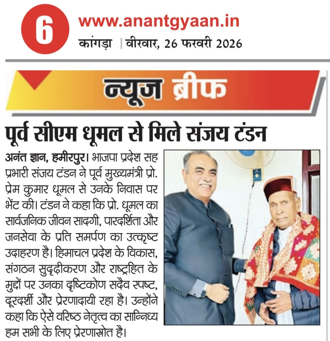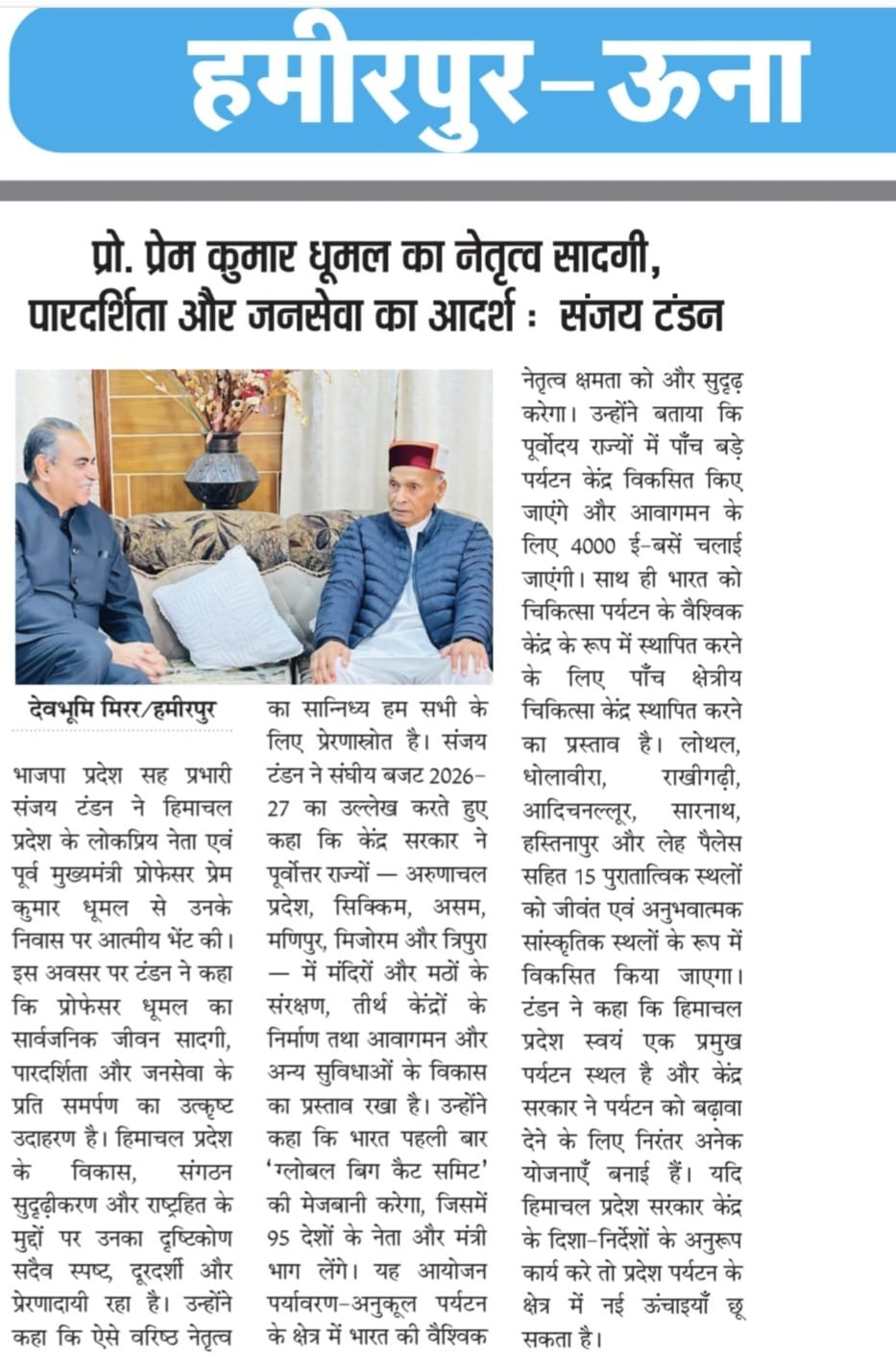 पूर्व सीएम प्रो. प्रेम कुमार धूमल का नेतृत्व सादगी, पारदर्शिता और जनसेवा का आदर्श : संजय टंडन +16 more storiesकेंद्र की पर्यटन व सांस्कृतिक योजनाओं से हिमाचल छुएगा नई ऊंचाइयाँ- 'जहाँ चाह वहाँ राह'Team Sanjay TandonFeb 26, 2026SharePreviousNext