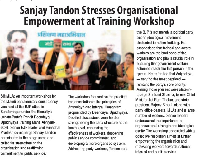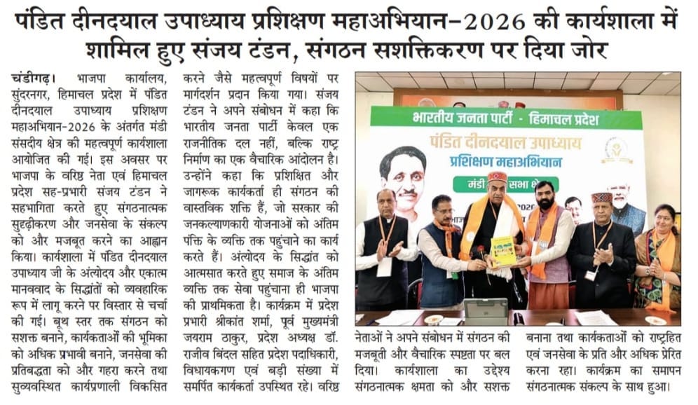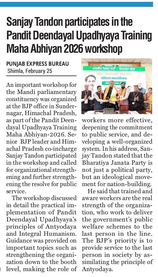 पंडित दीनदयाल उपाध्याय प्रशिक्षण महाअभियान-2026 की कार्यशाला में शामिल हुए संजय टंडन, संगठन सशक्तिकरण पर दिया जोर +3 more storiesTeam Sanjay TandonFeb 26, 2026SharePreviousNext
