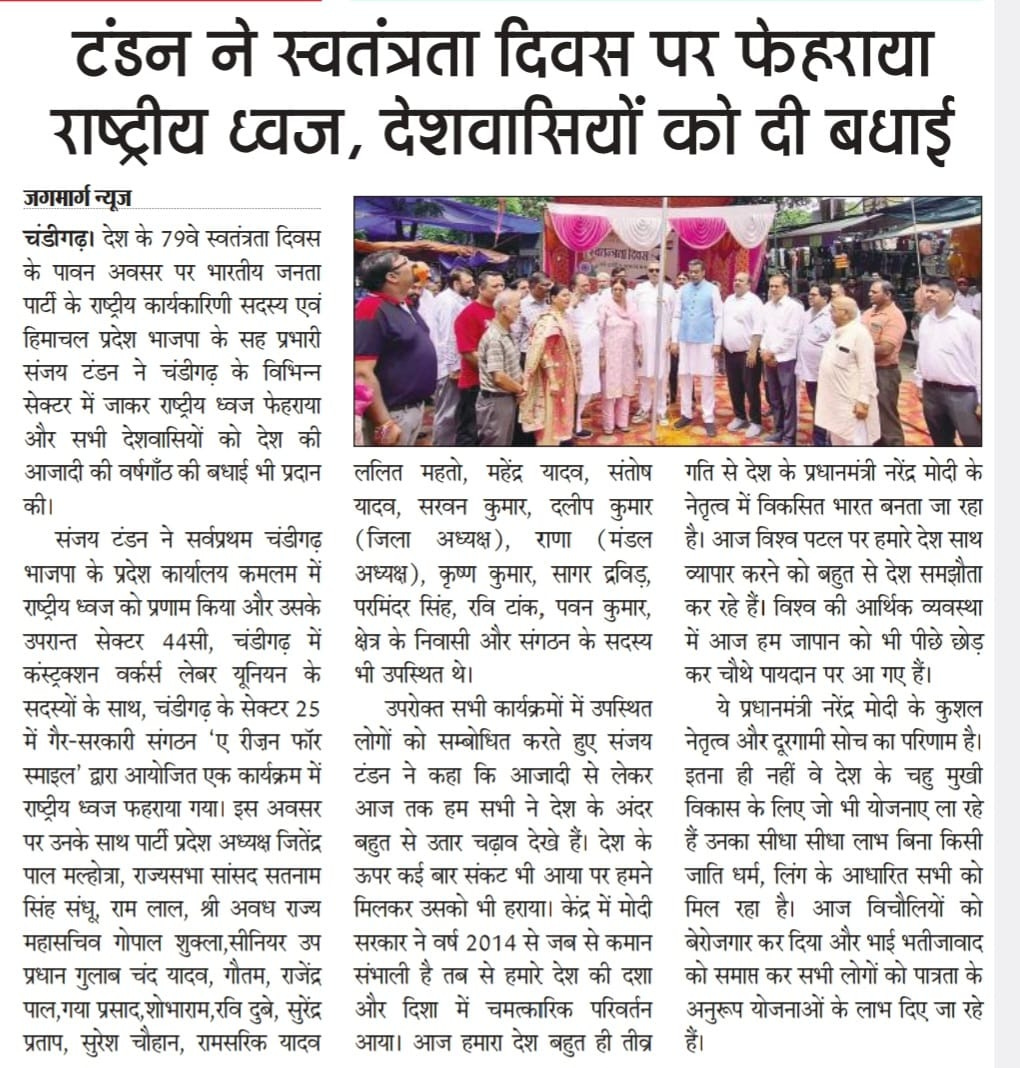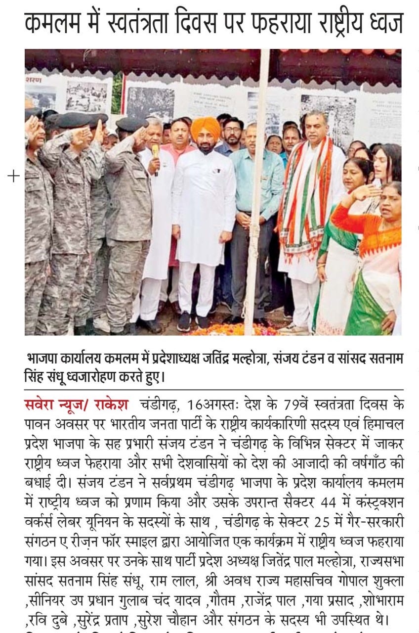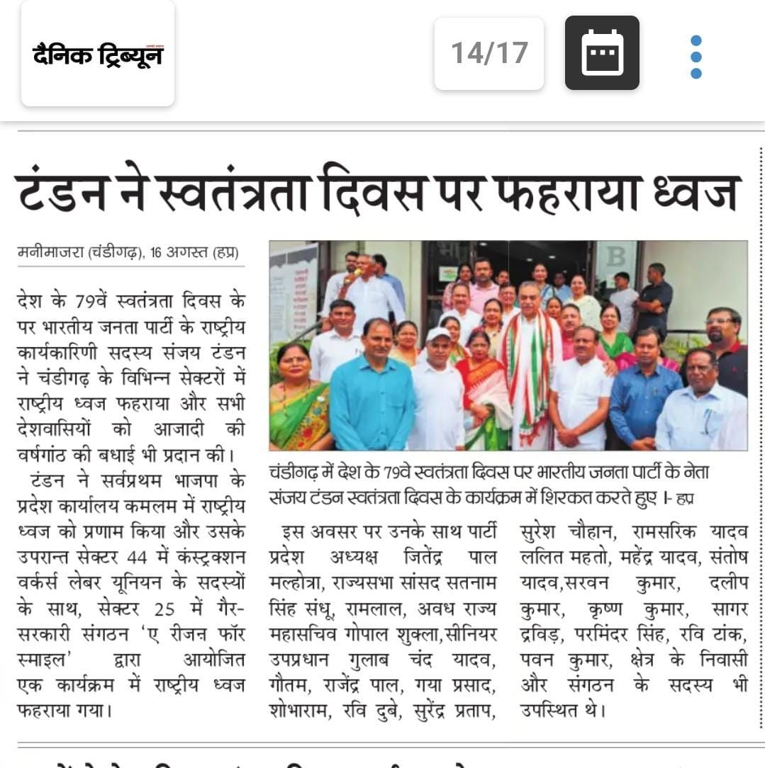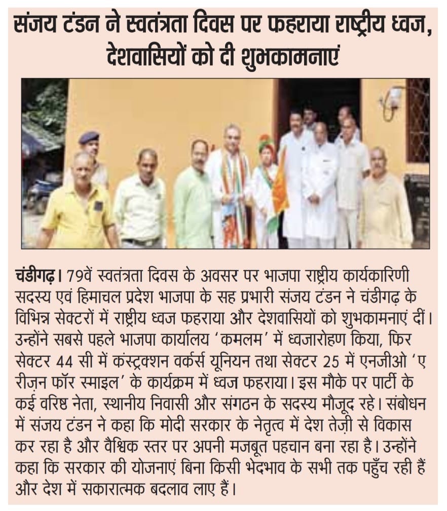 टंडन ने स्वतंत्रता दिवस पर फेहराया राष्ट्रीय ध्वज, देशवासियों को दी बधाई +3 more storiesTeam Sanjay TandonAug 17, 2025Shareटंडन ने स्वतंत्रता दिवस पर फहराया ध्वजसंजय टंडन ने स्वतंत्रता दिवस पर फहराया राष्ट्रीय ध्वज, देशवासियों को दी शुभकामनाएंकमलम में स्वतंत्रता दिवस पर फहराया राष्ट्रीय ध्वजPreviousNext