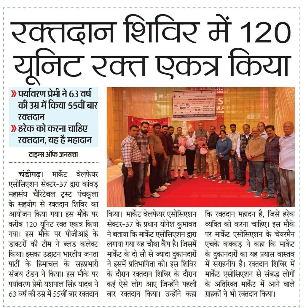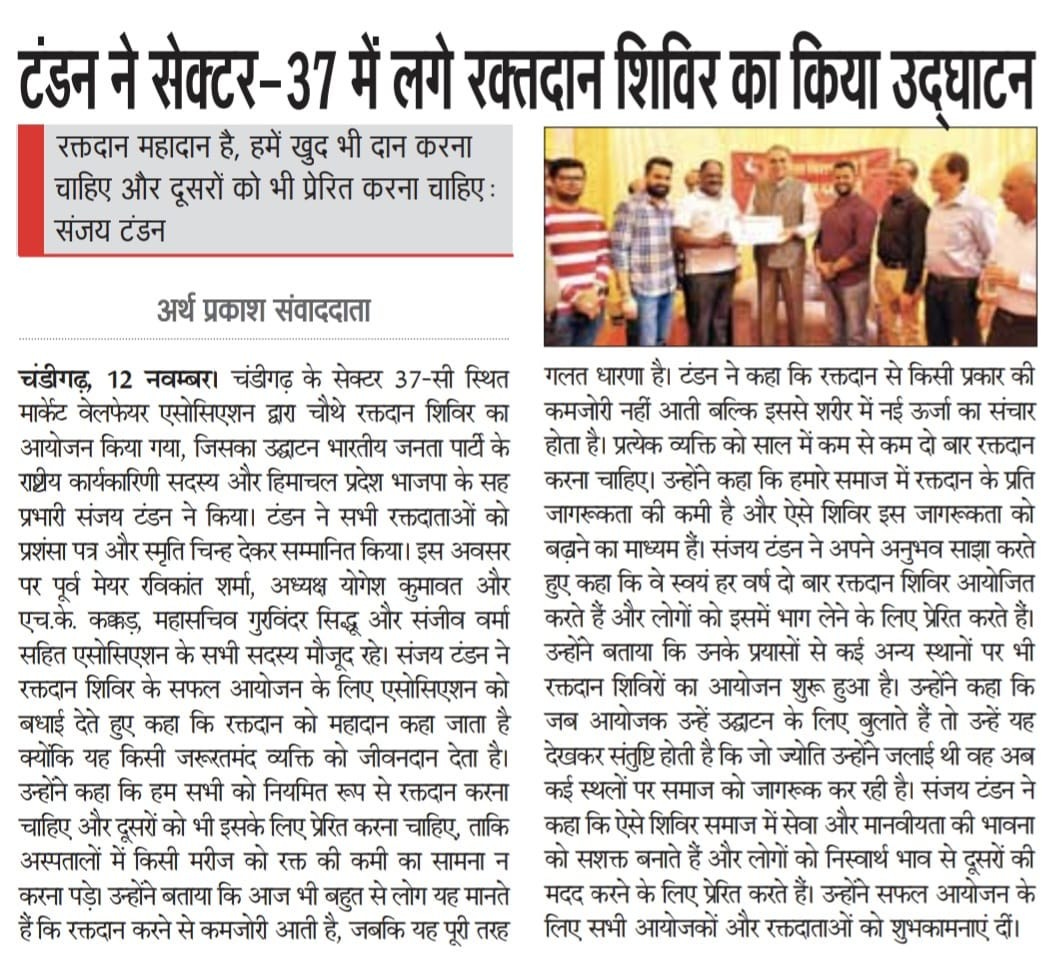 टंडन ने सेक्टर-37 में लगे रक्तदान शिविर का किया उद्घाटन +1 more storyरक्तदान महादान है, हमें खुद भी दान करना चाहिए और दूसरों को भी प्रेरित करना चाहिए: संजय टंडनTeam Sanjay TandonNov 13, 2025SharePrevious