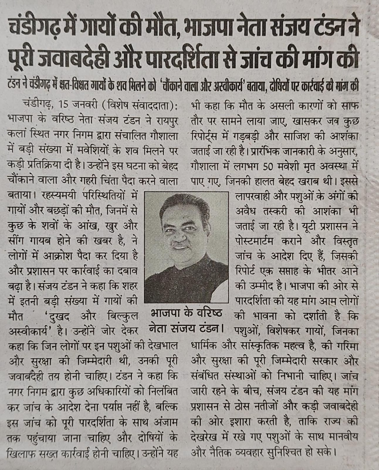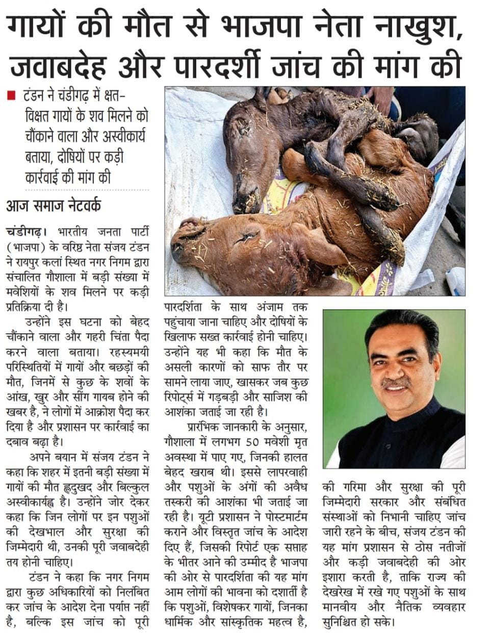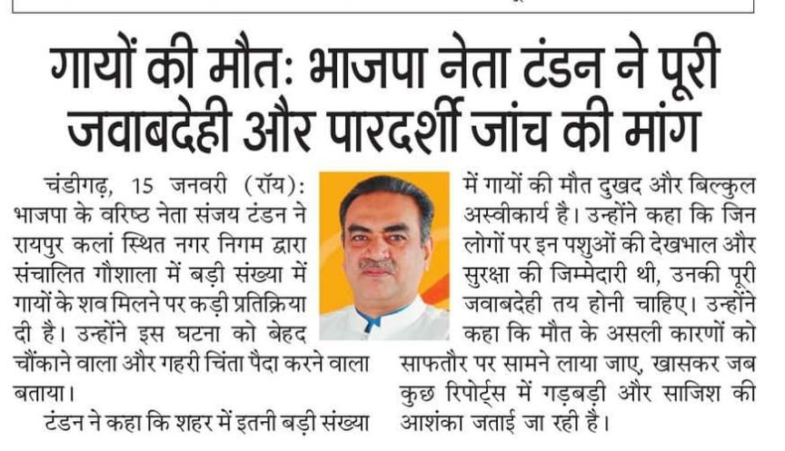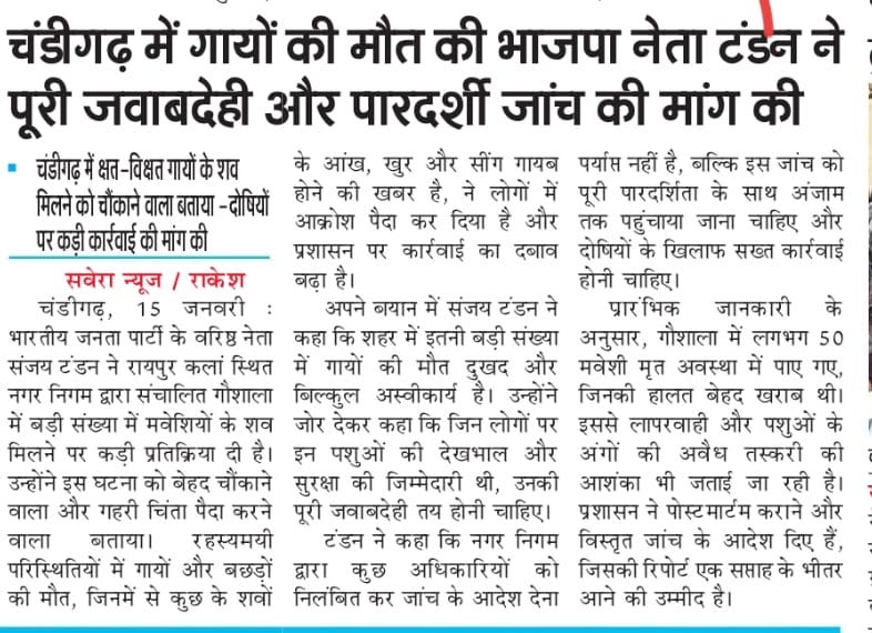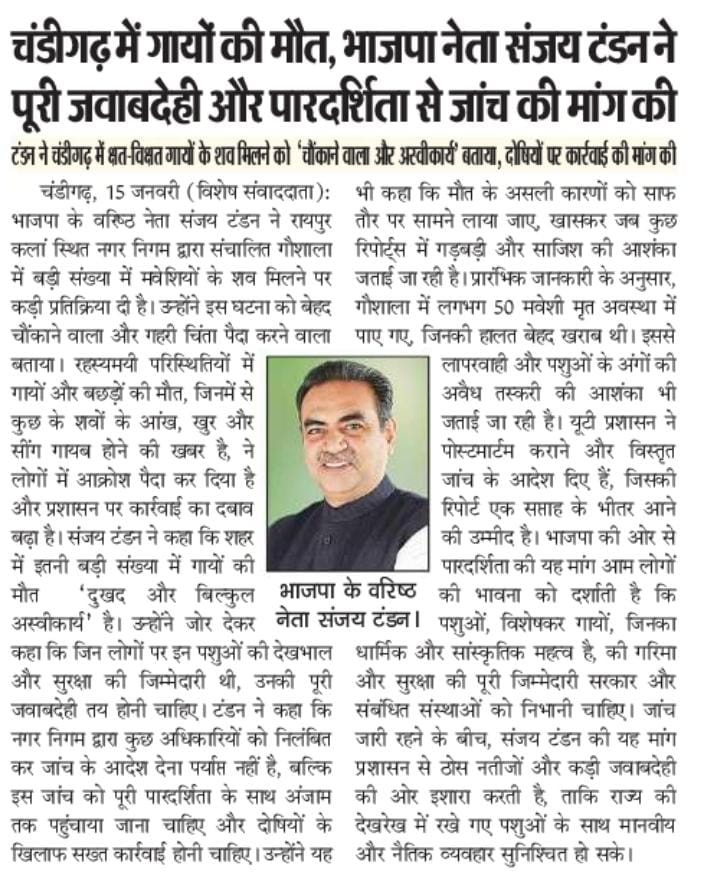 चंडीगढ़ में गायों की मौत, भाजपा नेता संजय टंडन ने पूरी जवाबदेही और पारदर्शिता से जांच की मांग की +4 more storiesटंडन ने चंडीगढ़ में क्षत-विक्षत गायों के शव मिलने को 'चौंकाने वाला और अस्वीकार्य' बताया, दोषियों पर कार्रवाई की मांग कीTeam Sanjay TandonJan 16, 2026SharePreviousNext