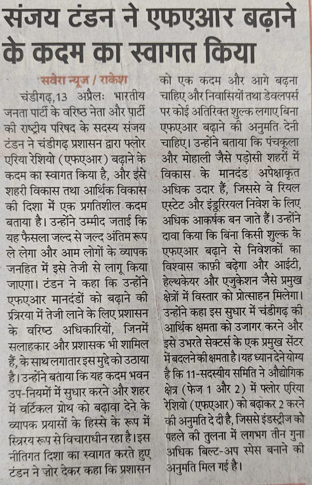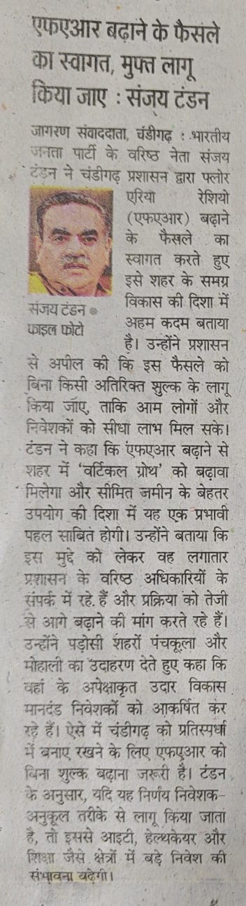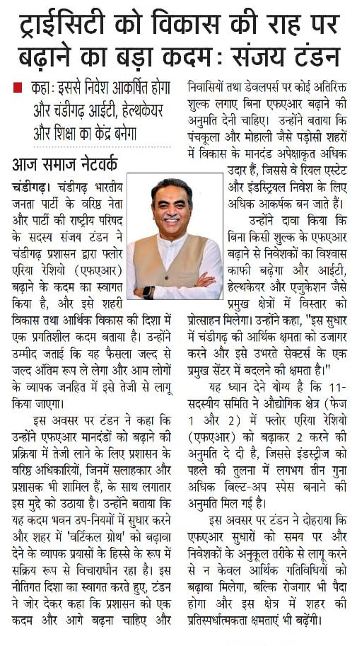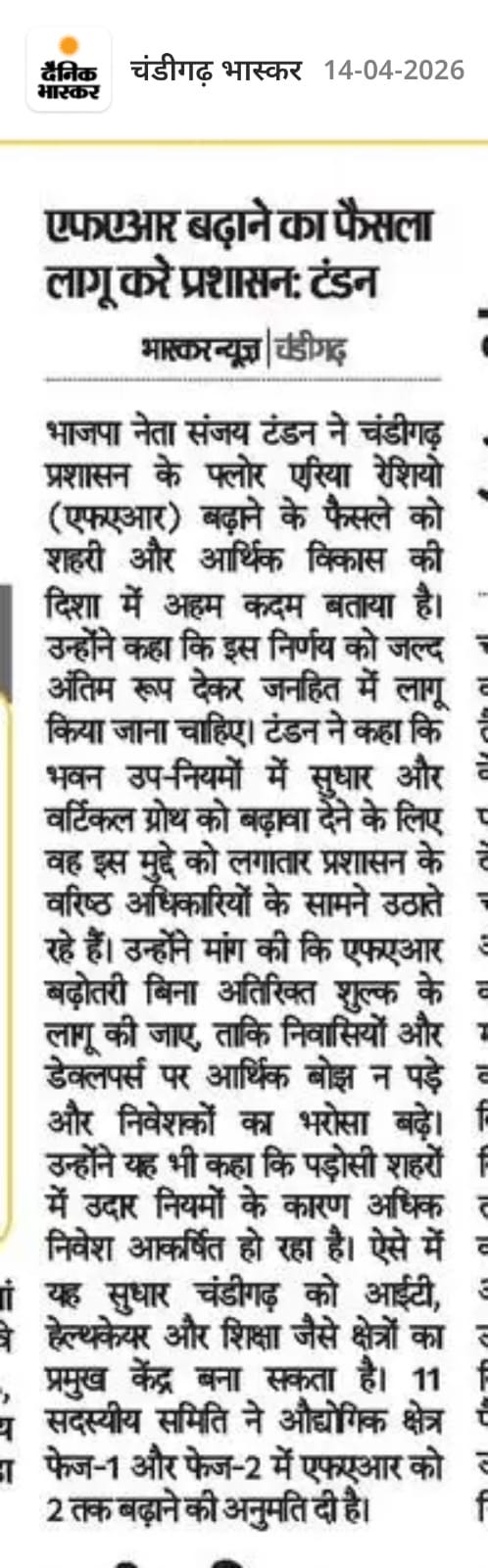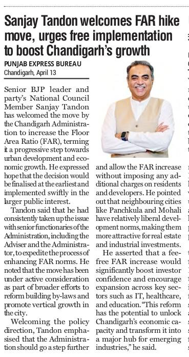 ट्राईसिटी को विकास की राह पर बढ़ाने का बड़ा कदम : संजय टंडन +4 more storiesकहा : इससे निवेश आकर्षित होगा और चंडीगढ़ आईटी, हेल्थकेयर और शिक्षा का केंद्र बनेगा Team Sanjay TandonApr 14, 2026SharePrevious