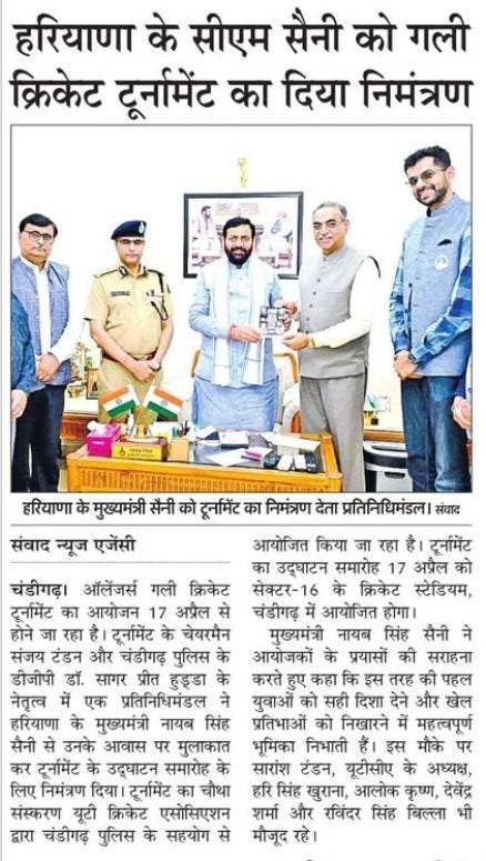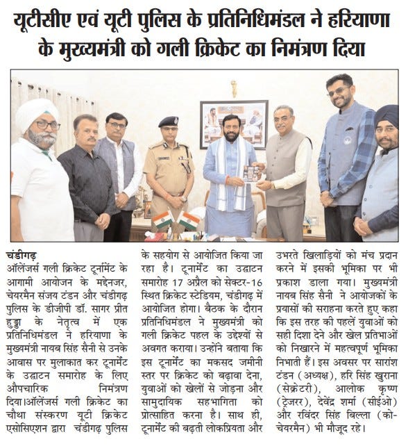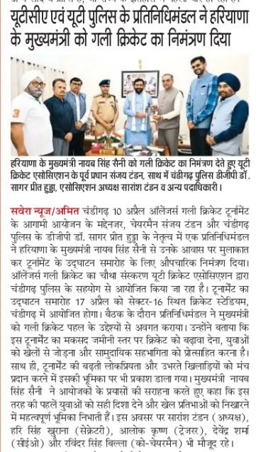 यूटीसीए एवं यूटी पुलिस के प्रतिनिधिमंडल ने हरियाणा के मुख्यमंत्री को गली क्रिकेट का निमंत्रण दिया +5 more storiesTeam Sanjay TandonApr 11, 2026SharePrevious