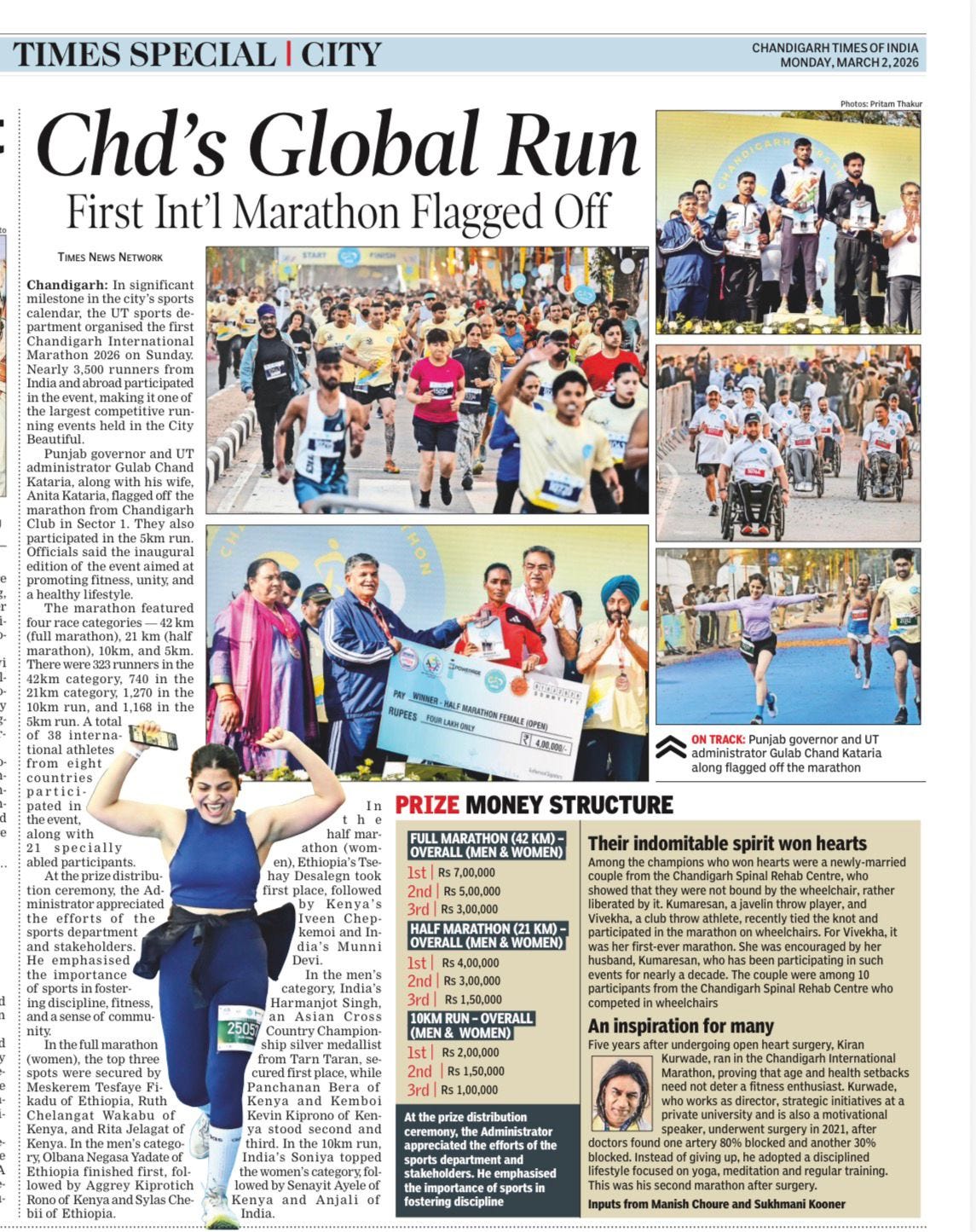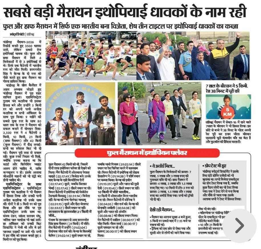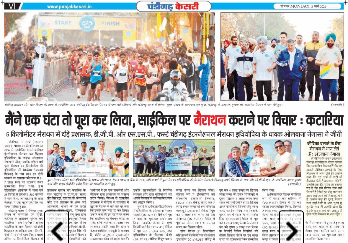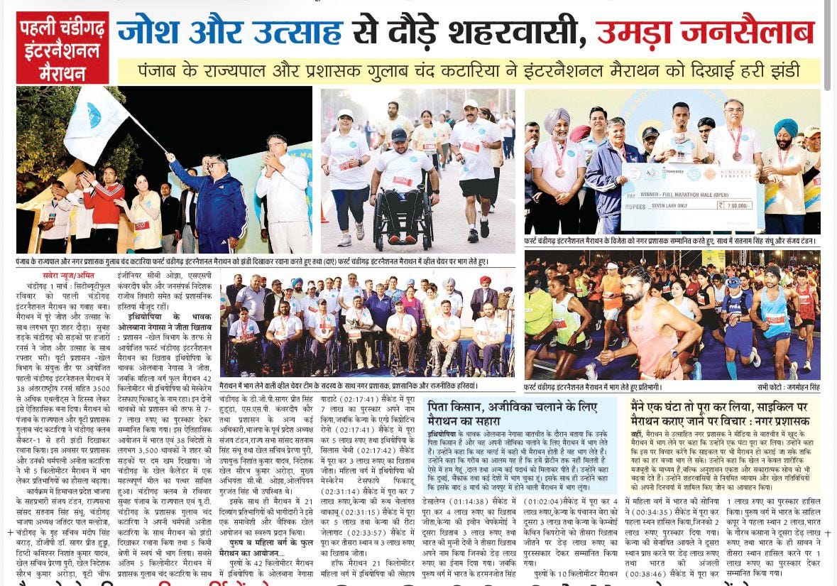 पहली चंडीगढ़ इंटरनैशनल मैराथन: जोश और उत्साह से दौड़े शहरवासी, उमड़ा जनसैलाब +6 more storiesपंजाब के राज्यपाल और प्रशासक गुलाब चंद कटारिया ने इंटरनैशनल मैराथन को दिखाई हरी झंडीTeam Sanjay TandonMar 02, 2026SharePreviousNext
