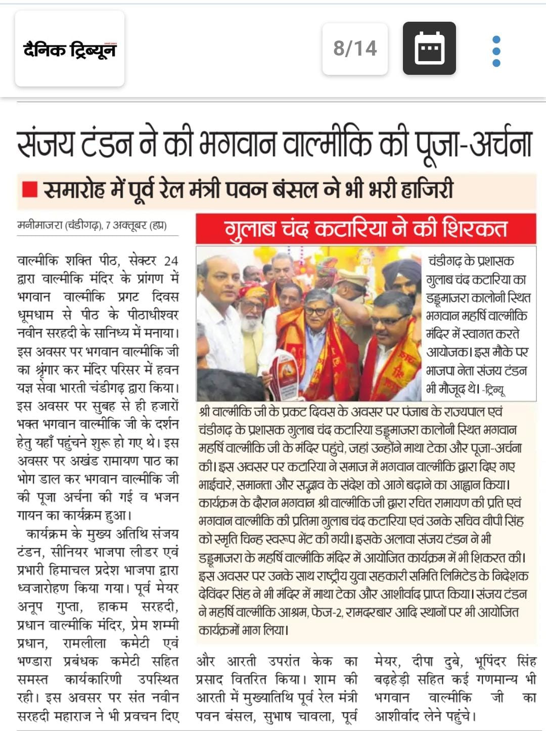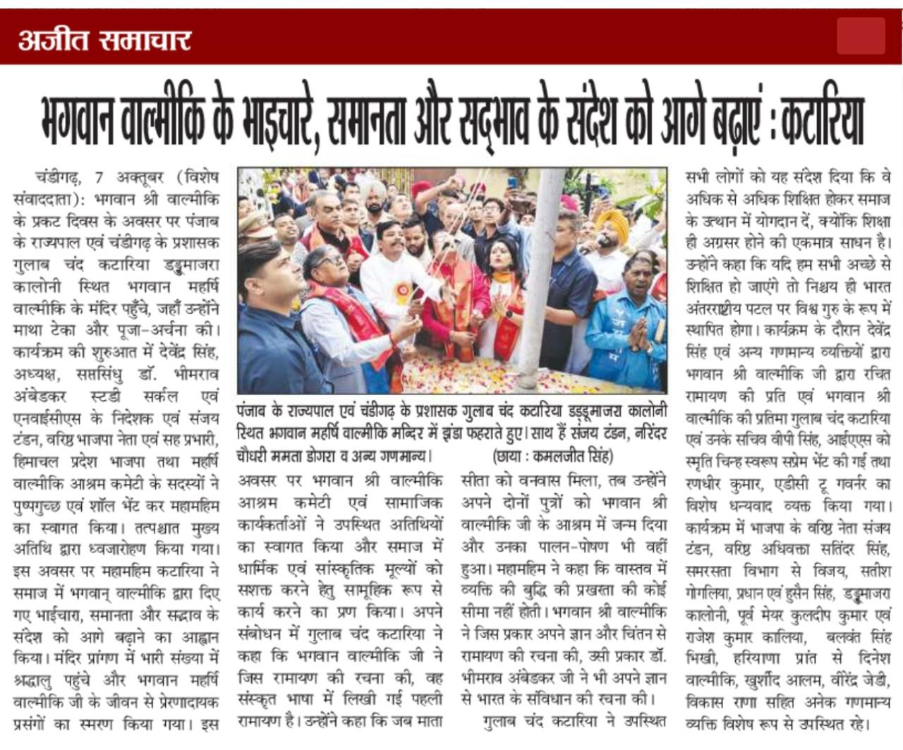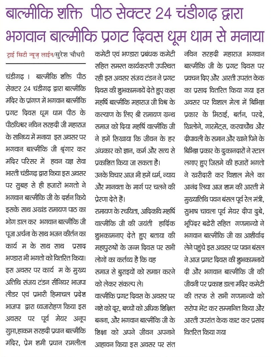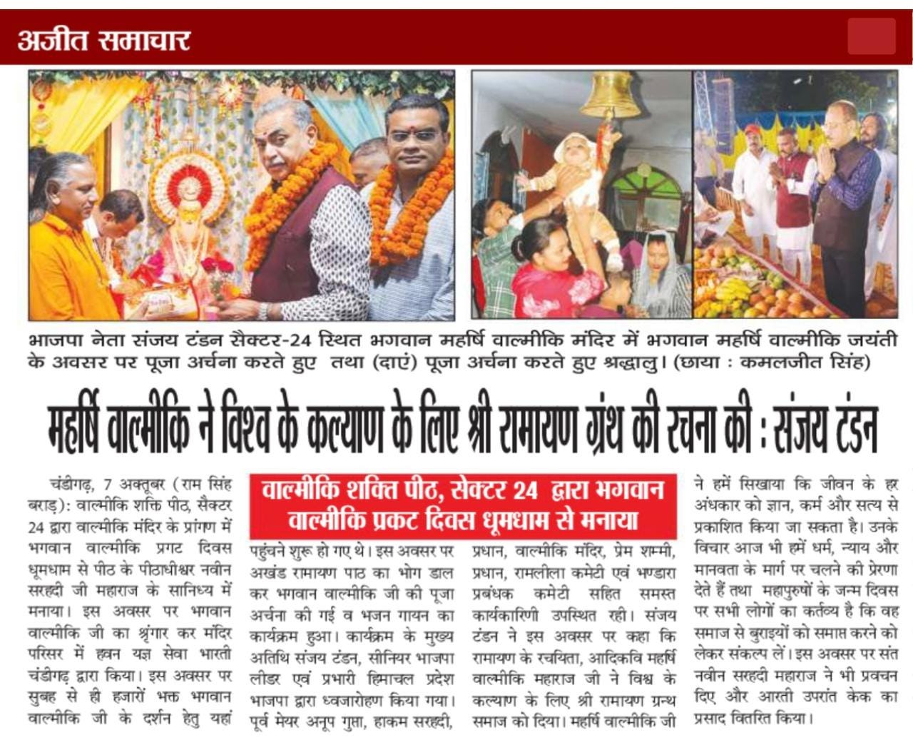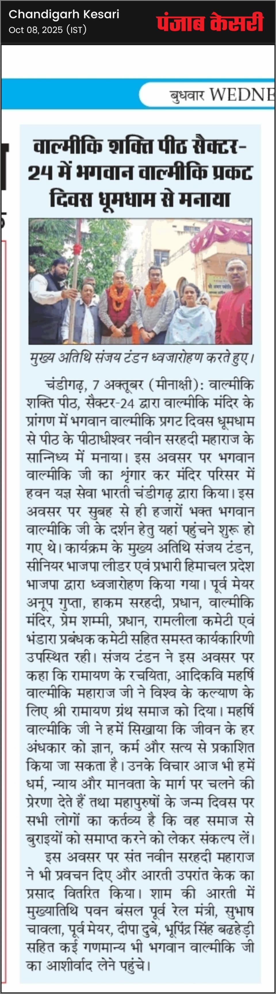 वाल्मीकि शक्ति पीठ सेक्टर 24 चंडीगढ़ द्वारा भगवान वाल्मीकि प्रगट दिवस धूम धाम से मनाया