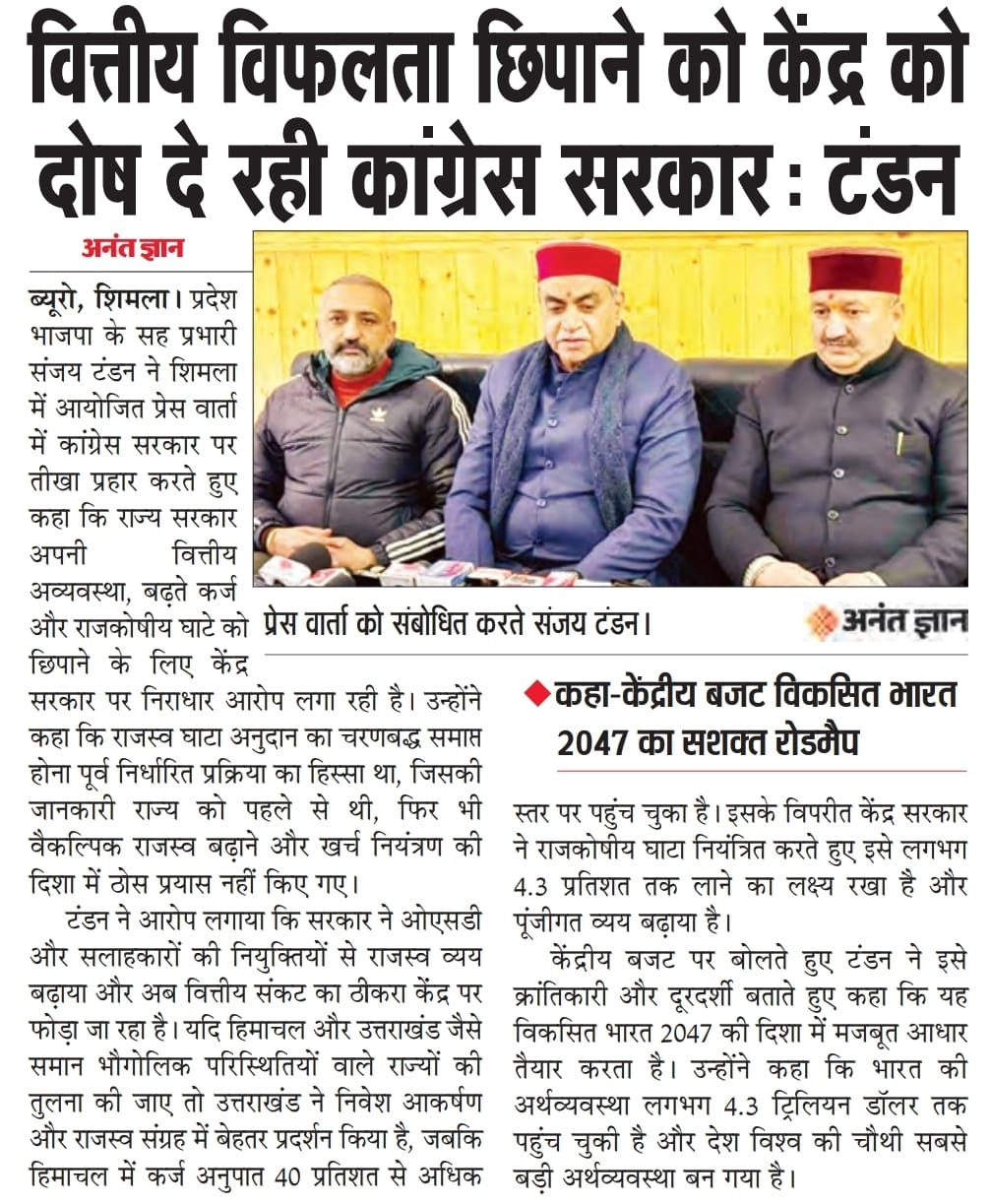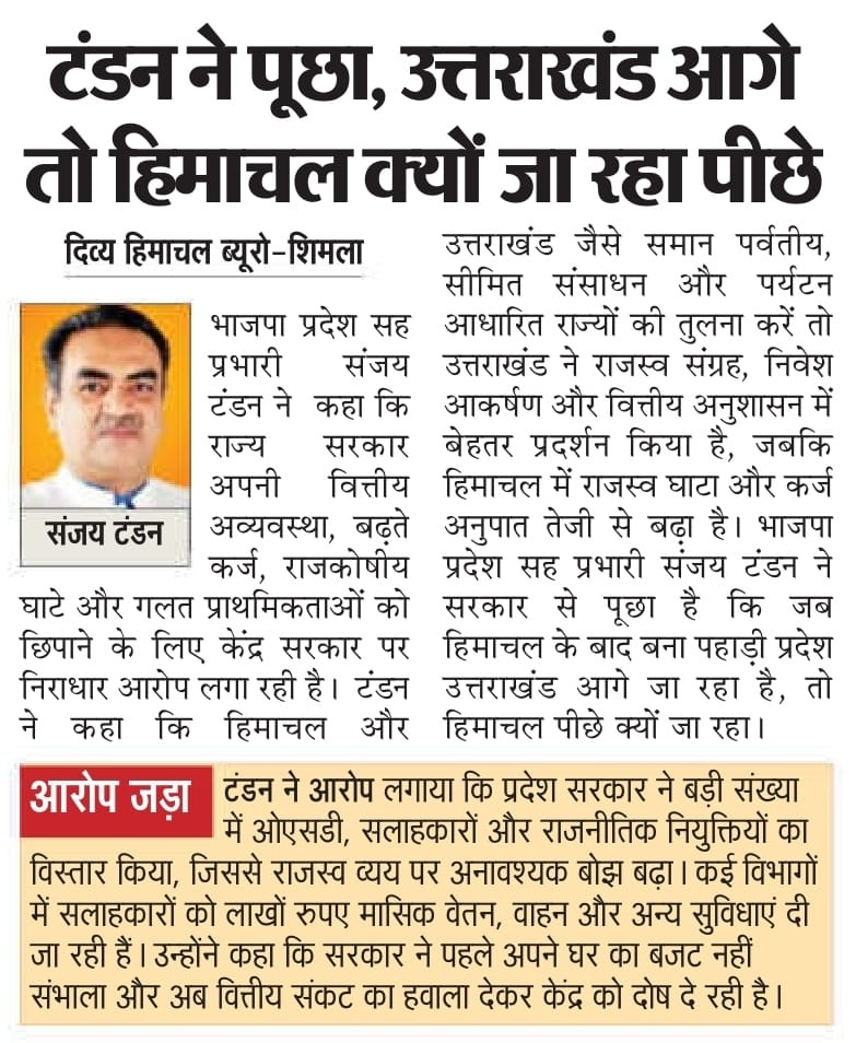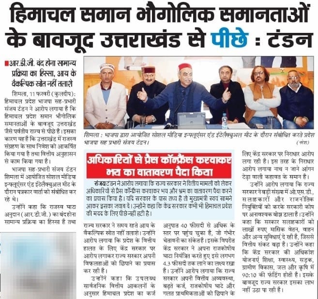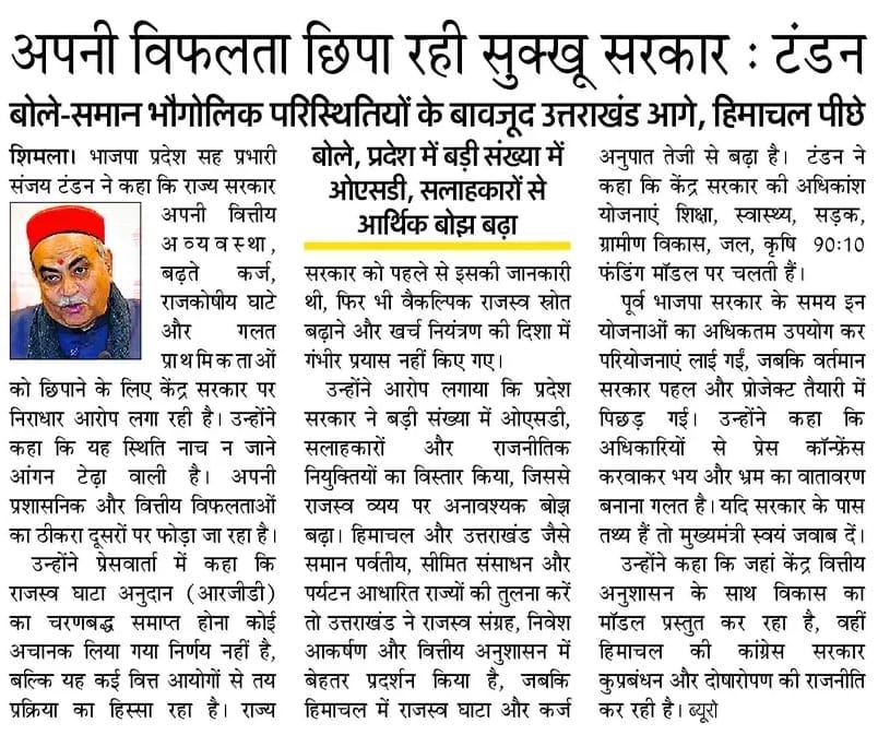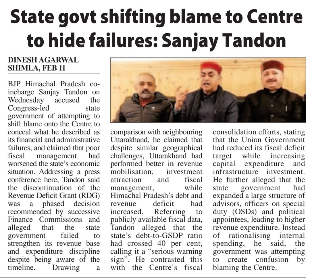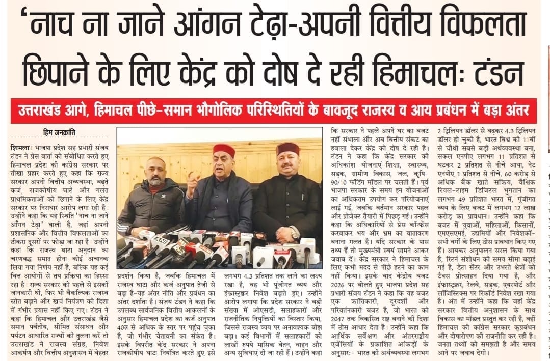 'नाच ना जाने आंगन टेढ़ा - अपनी वित्तीय विफलता छिपाने के लिए केंद्र को दोष दे रही हिमाचल: टंडन +6 more stories उत्तराखंड आगे, हिमाचल पीछे - समान भौगोलिक परिस्थितियों के बावजूद राजस्व व आय प्रबंधन में बड़ा अंतरTeam Sanjay TandonFeb 12, 20261SharePreviousNext