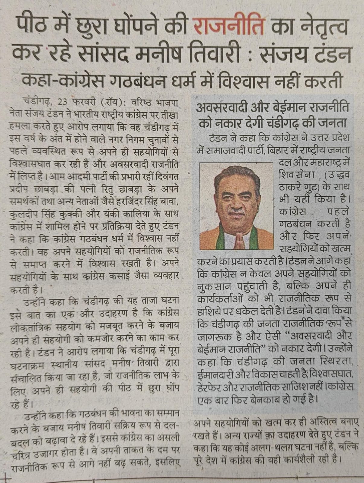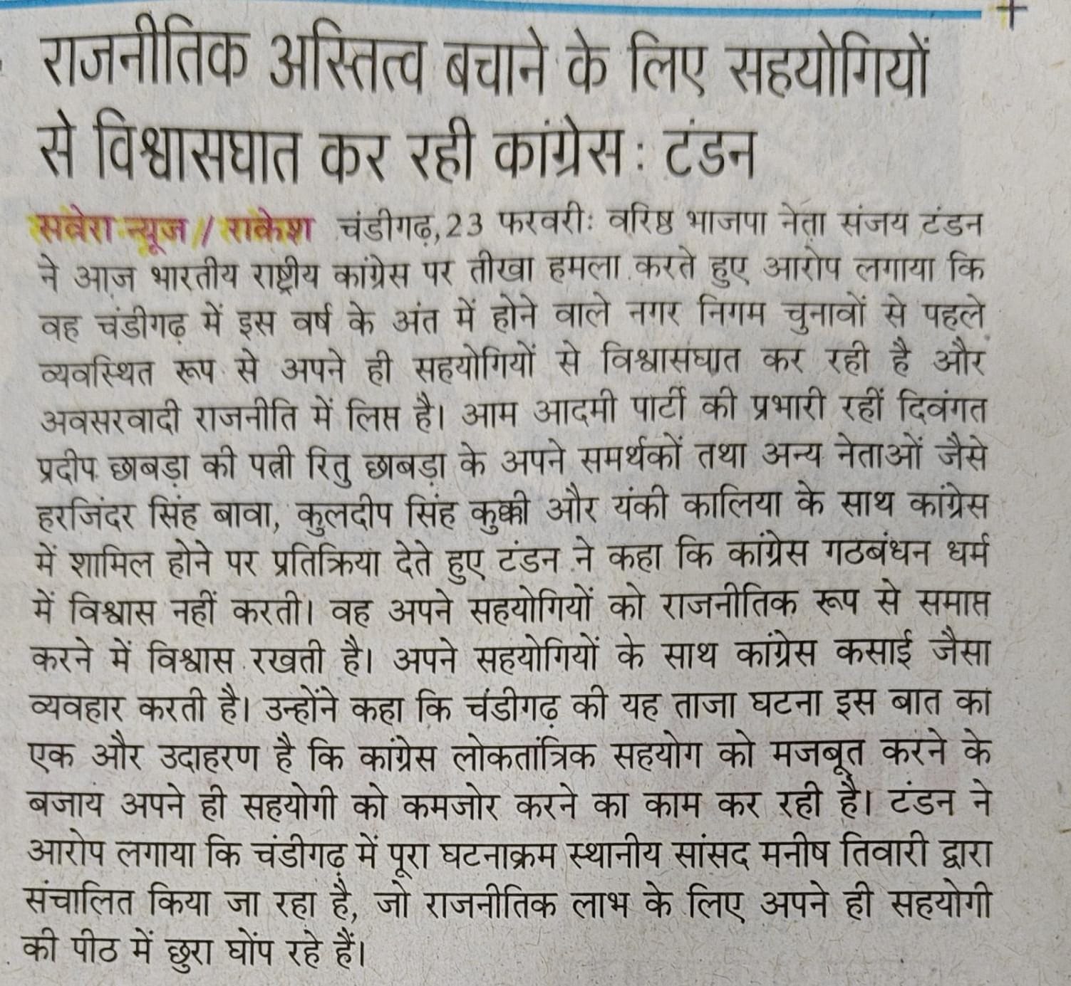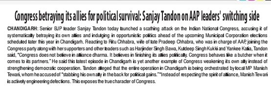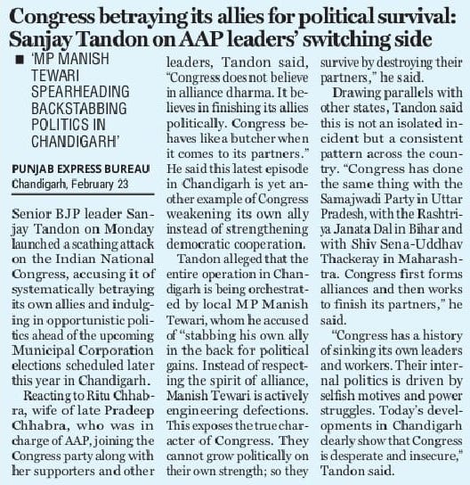 पीठ में छुरा घोंपने की राजनीति का नेतृत्व में कर रहे सांसद मनीष तिवारी : संजय टंडन +7 more storiesकहा- कांग्रेस गठबंधन धर्म में विश्वास नहीं करतीTeam Sanjay TandonFeb 24, 2026SharePreviousNext