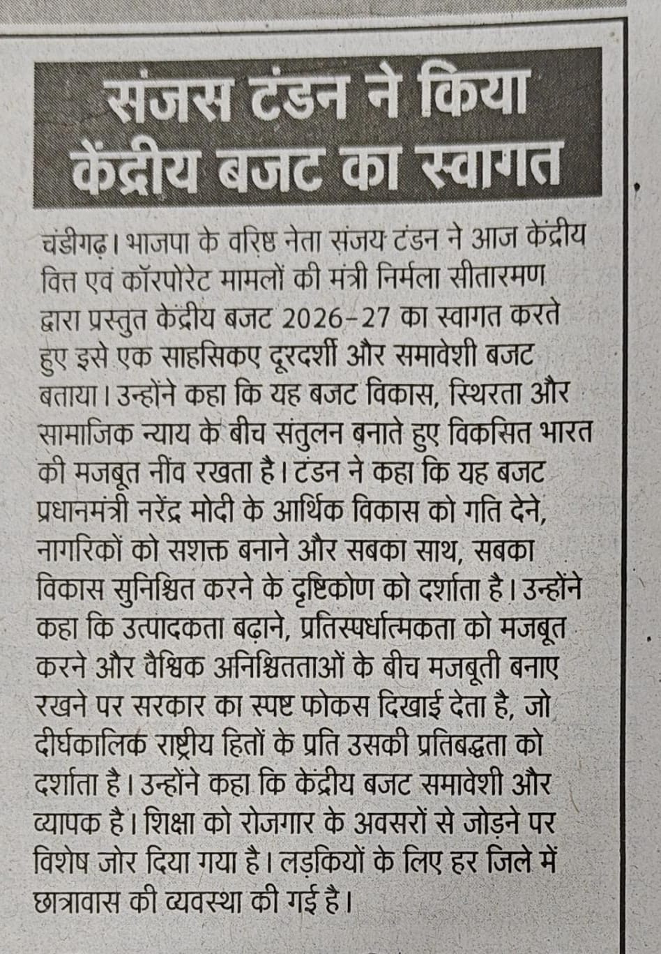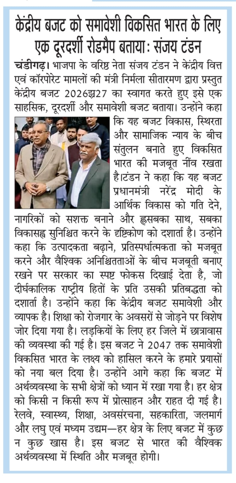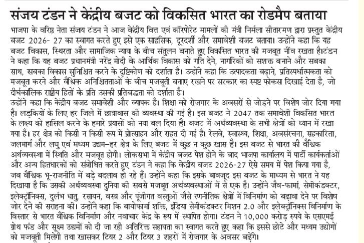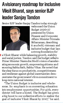 केंद्रीय बजट को समावेशी विकसित भारत के लिए एक दूरदर्शी रोडमैप बतायाः संजय टंडन +8 more storiesTeam Sanjay TandonFeb 02, 20261ShareSenior BJP leader Sanjay Tandon hails Union Budget 2026- 27 as a visionary roadmap for inclusive Viksit BharatUnion Budget is visionary roadmap for inclusive Viksit Bharat: Sr BJP leader Sanjay TandonPreviousNext