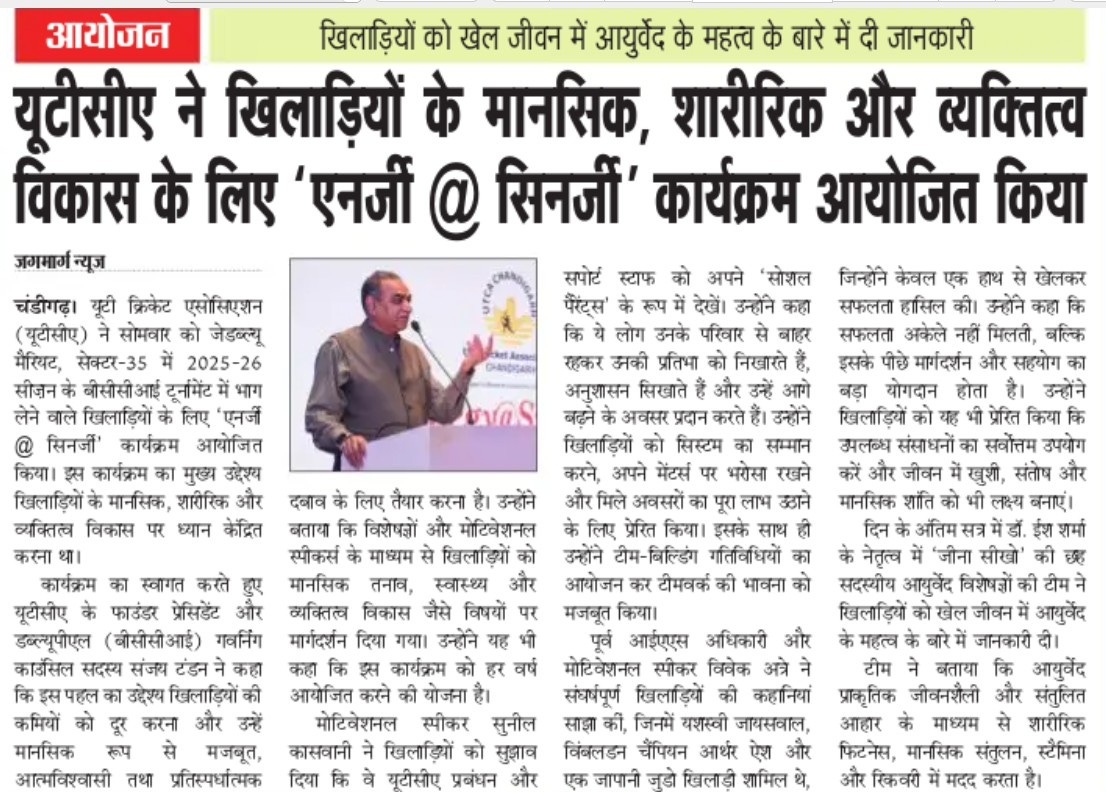 यू.टी.सी.ए. ने खिलाडियों के लिए एनर्जी@सिनर्जी कार्यक्रम आयोजित किया +8 more stories विशेषज्ञों और मोटीवेशनल स्पीकर्स के साथ संवाद से मार्गदर्शन दियाTeam Sanjay TandonMar 24, 2026SharePrevious