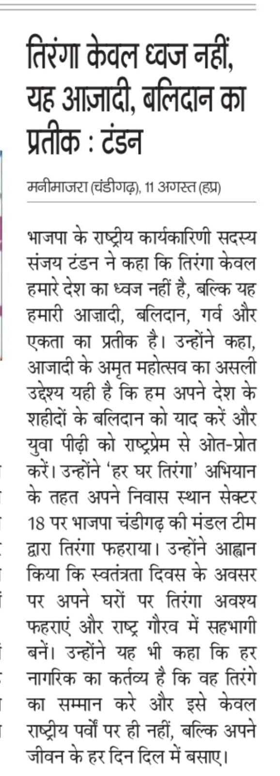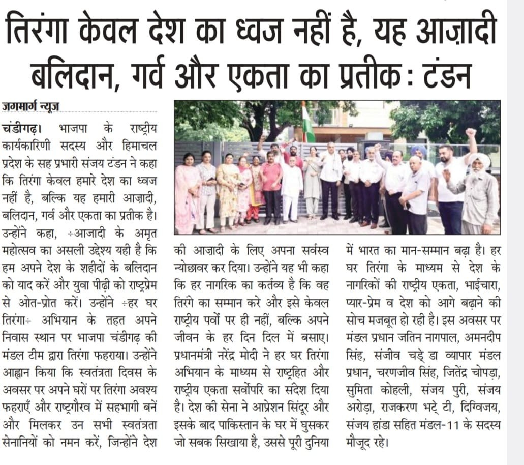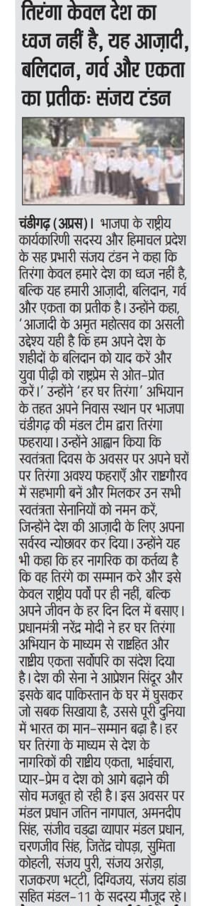 तिरंगा केवल देश का ध्वज नहीं है, यह आज़ादी बलिदान, गर्व और एकता का प्रतीक : टंडन