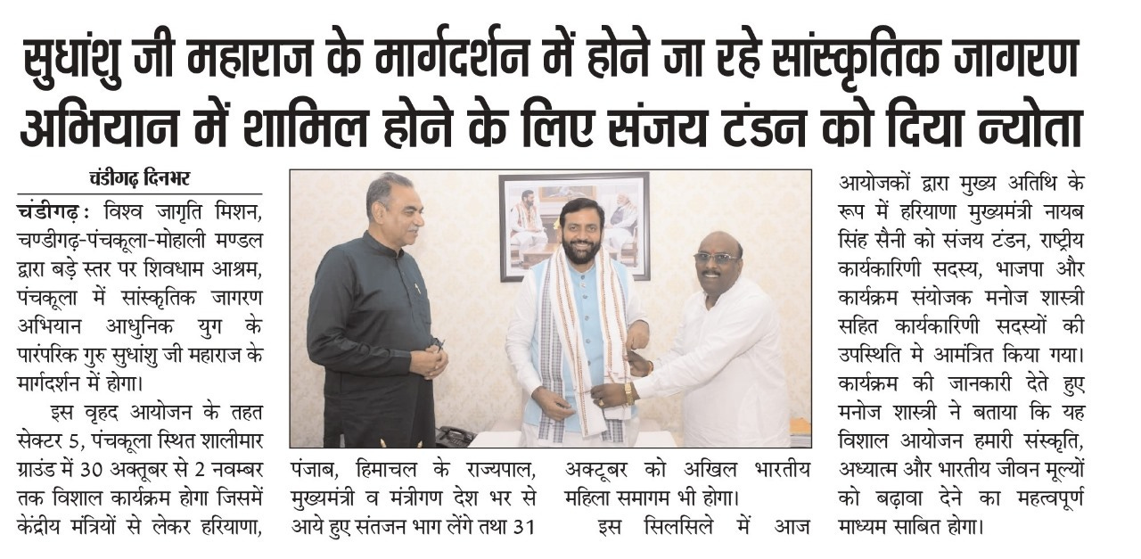 सुधांशु जी महाराज के मार्गदर्शन में होने जा रहे सांस्कृतिक जागरण अभियान में शामिल होने के लिए संजय टंडन को दिया न्योता
