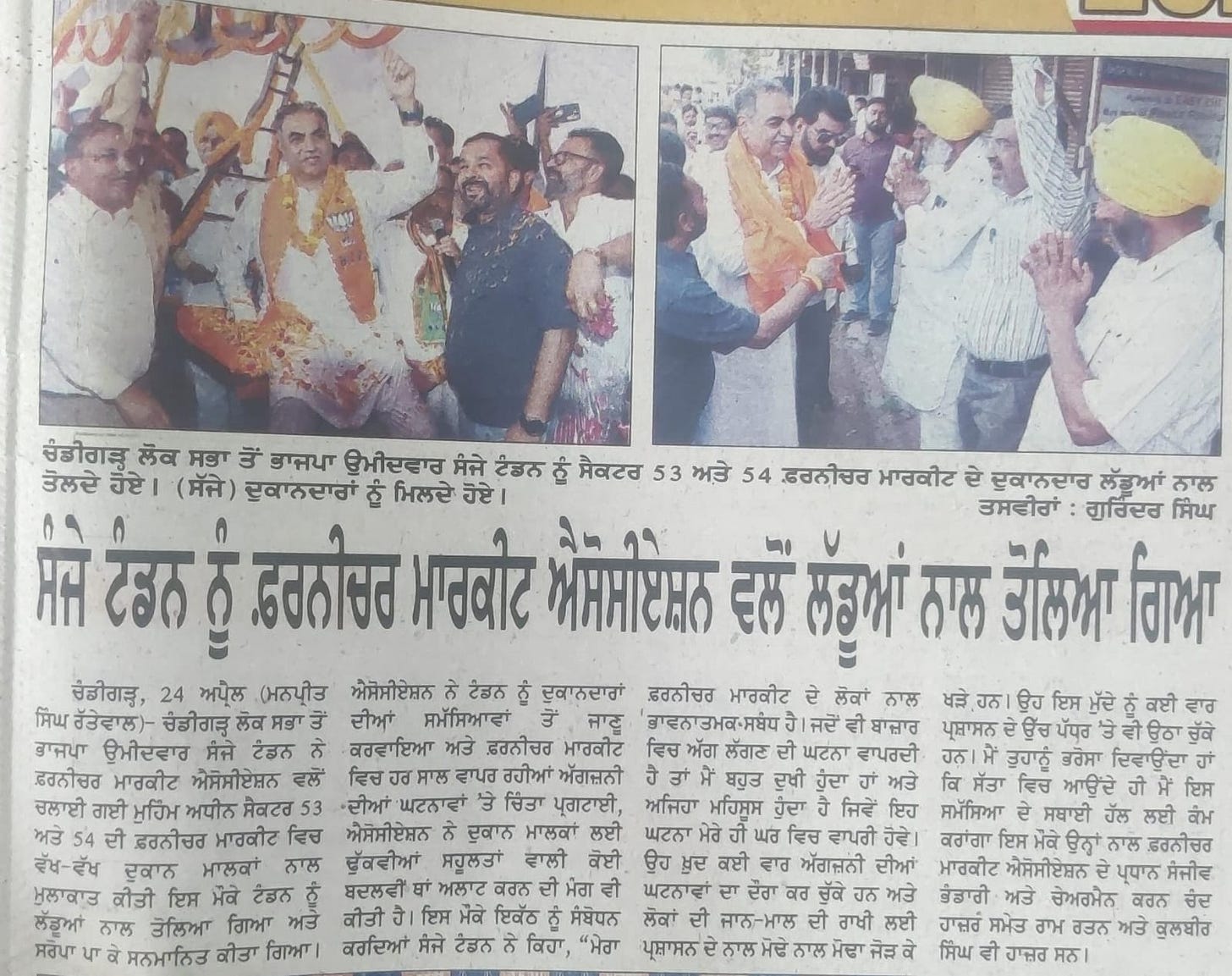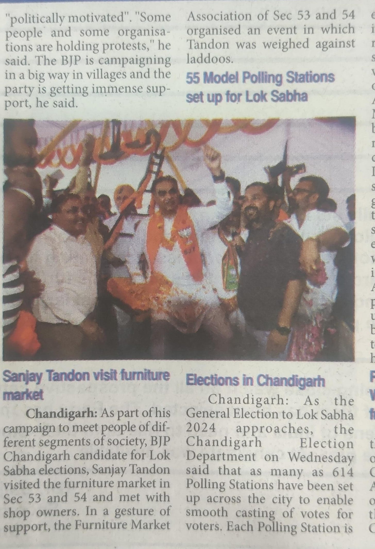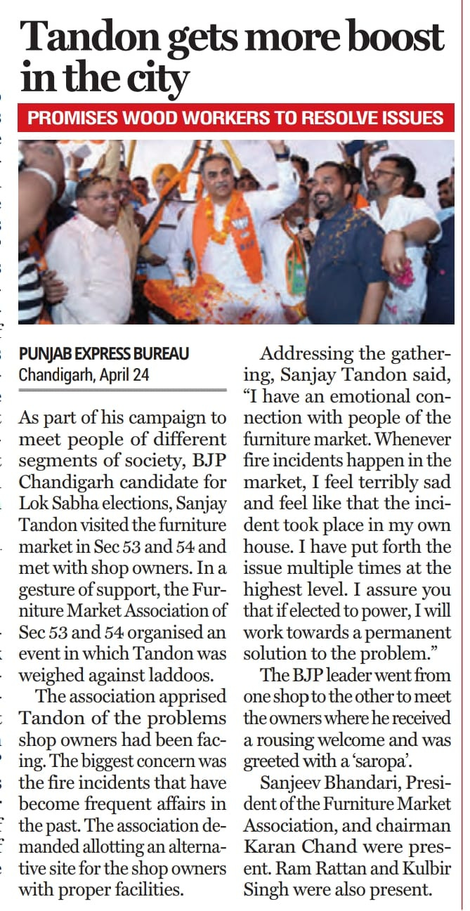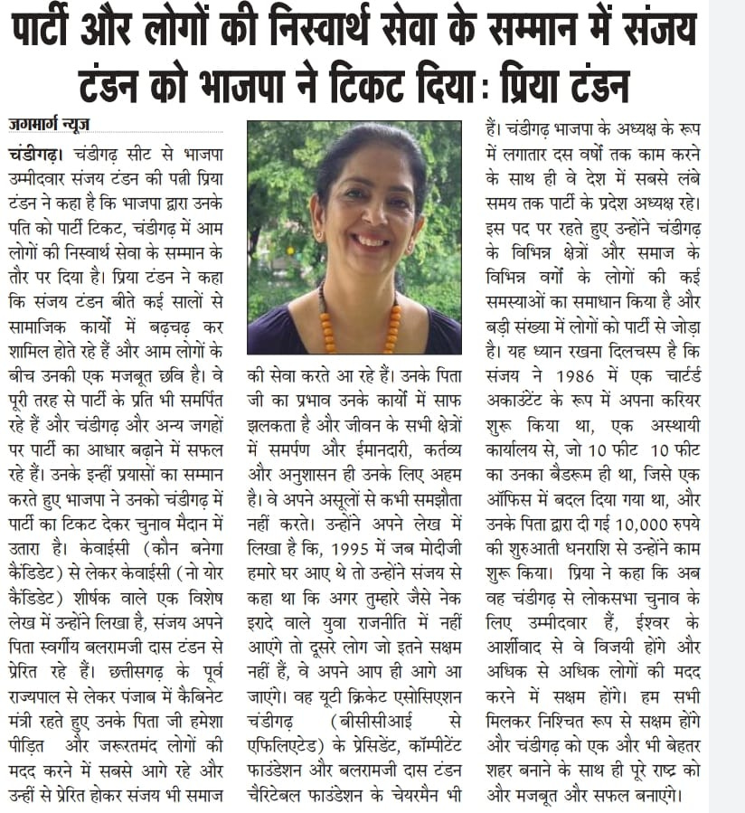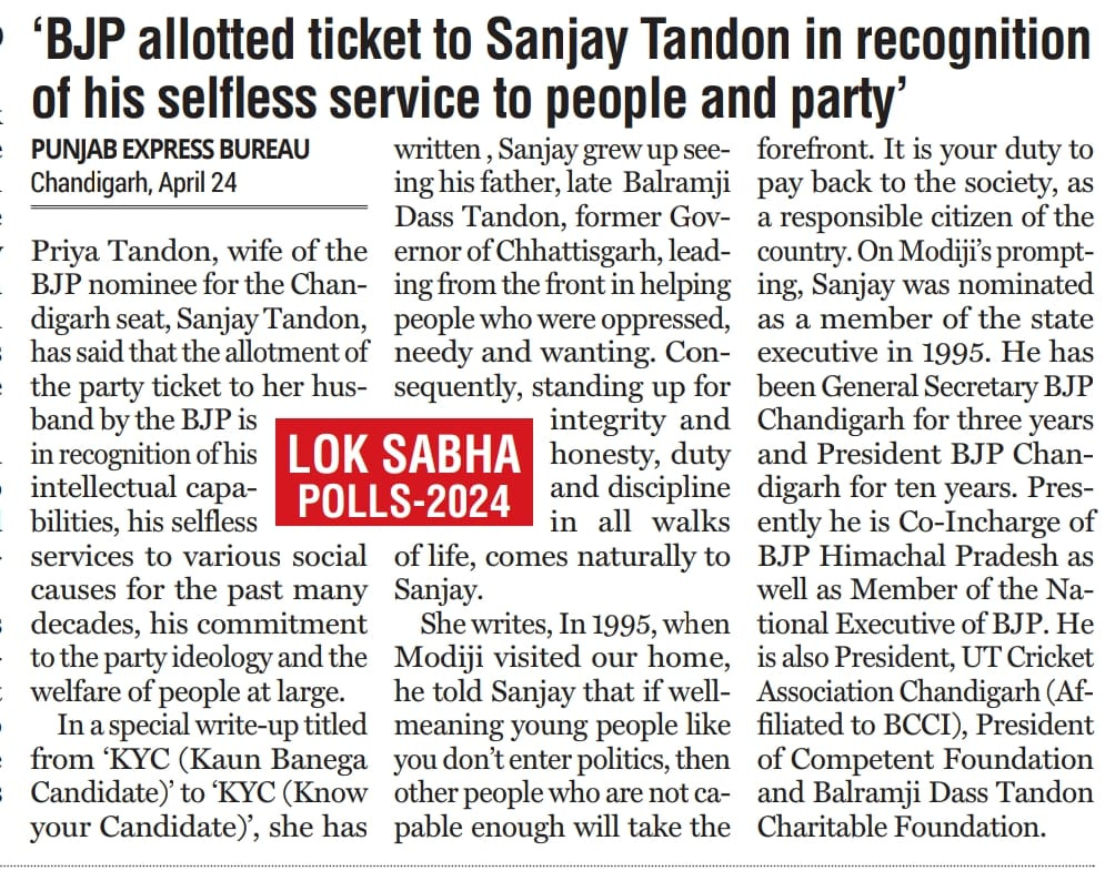 'BJP allotted ticket to Sanjay Tandon in recognition of his selfless service to people and party' +7 more storiesTribune, TOI, The Pioneer, The Indian Express, HT, Amar Ujala, Punjab KesariSanjay TandonApr 25, 20241SharePreviousNext