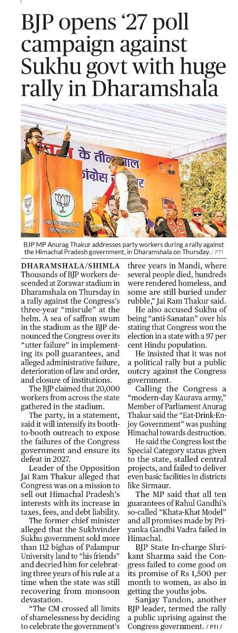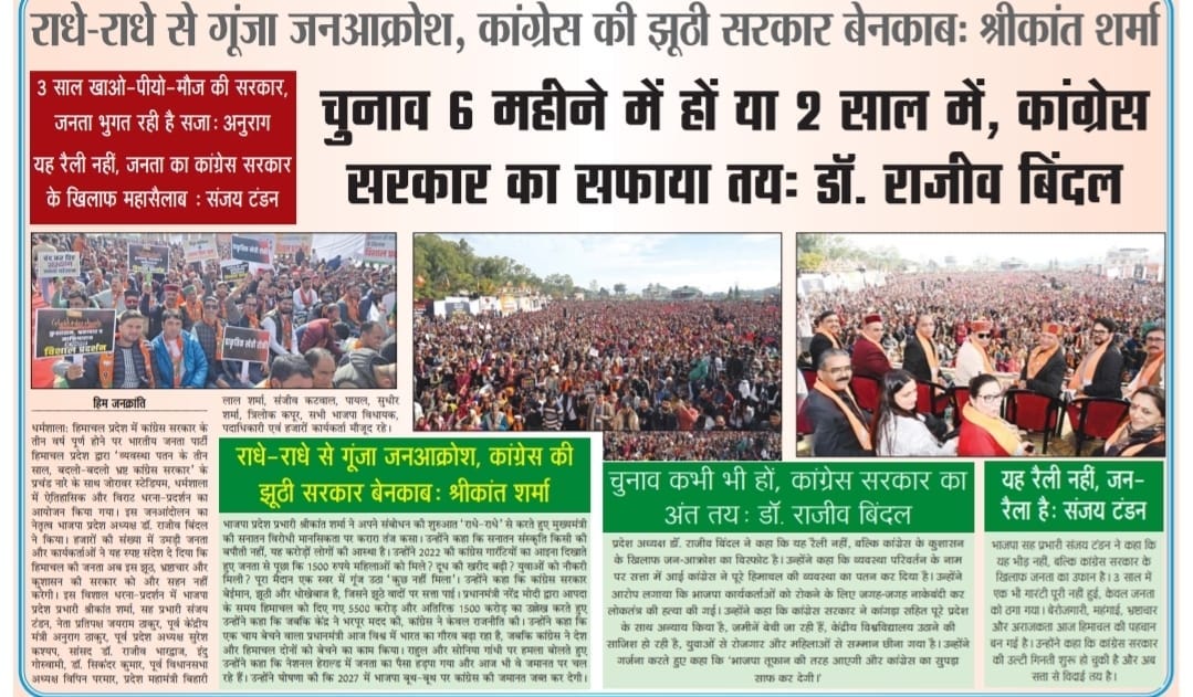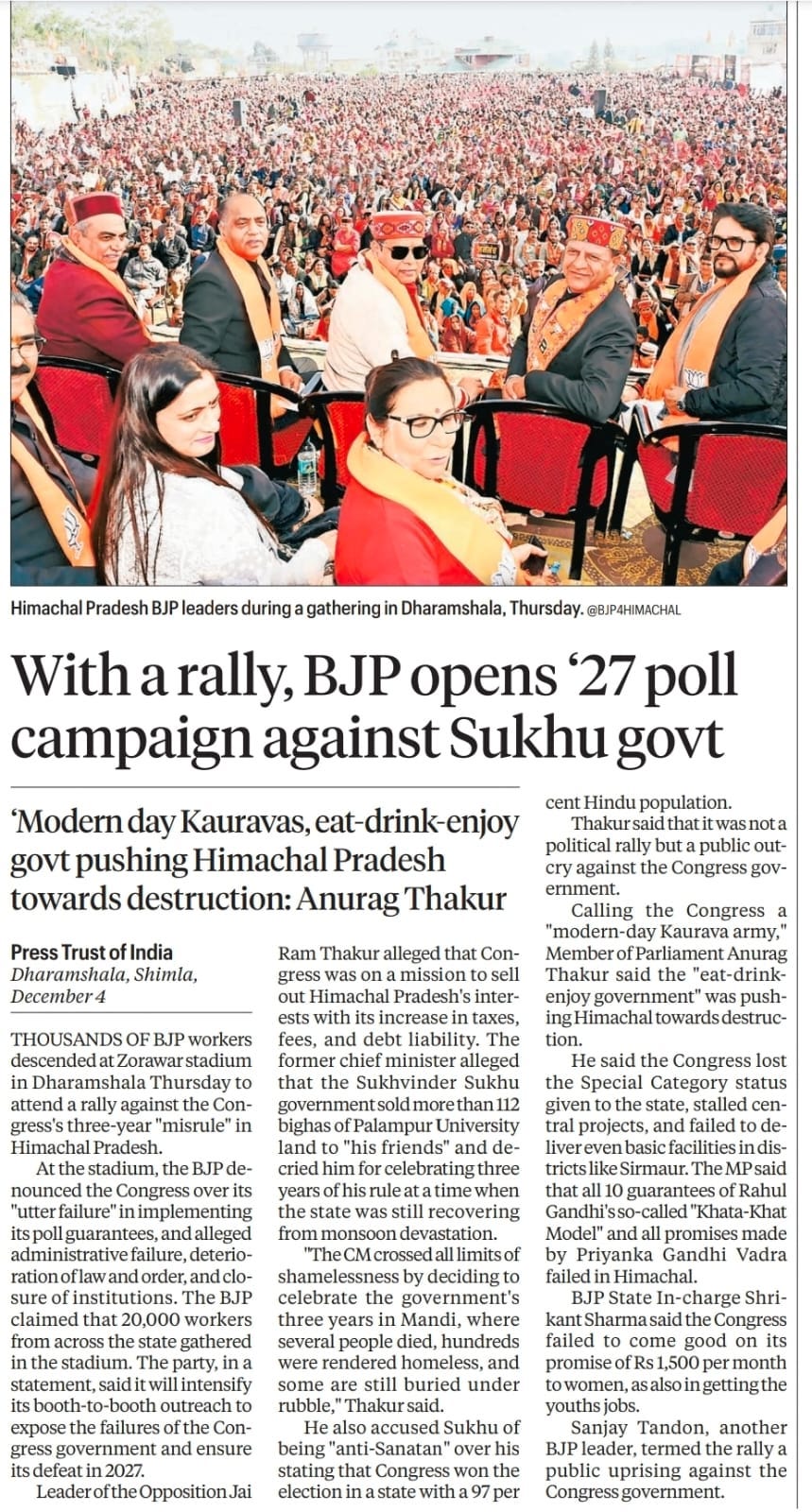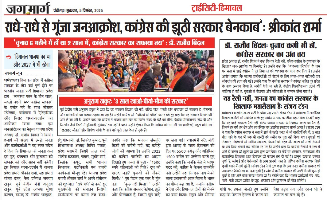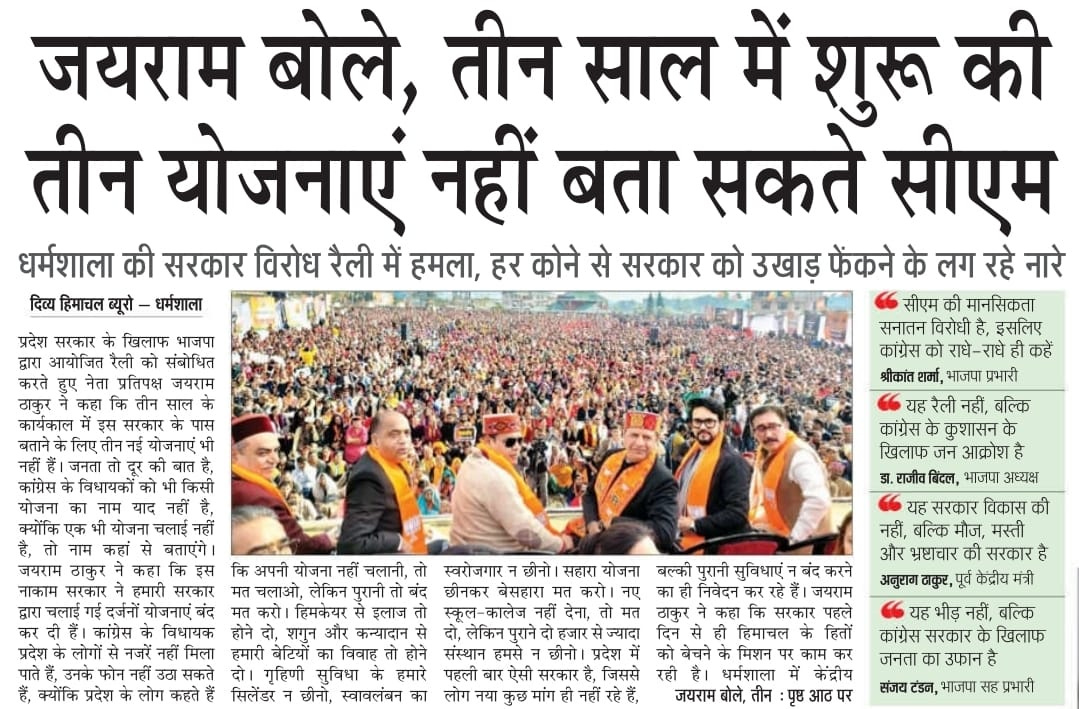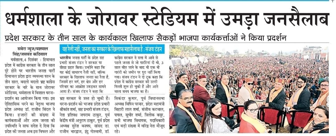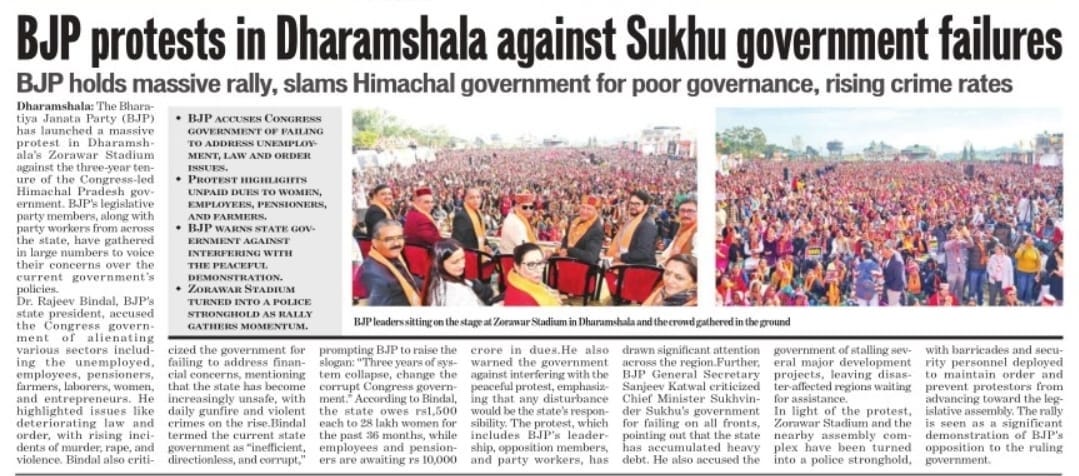 BJP protests in Dharamshala against Sukhu government failures +14 more storiesBJP holds massive rally, slams Himachal government for poor governance, rising crime ratesTeam Sanjay TandonDec 05, 2025SharePreviousNext