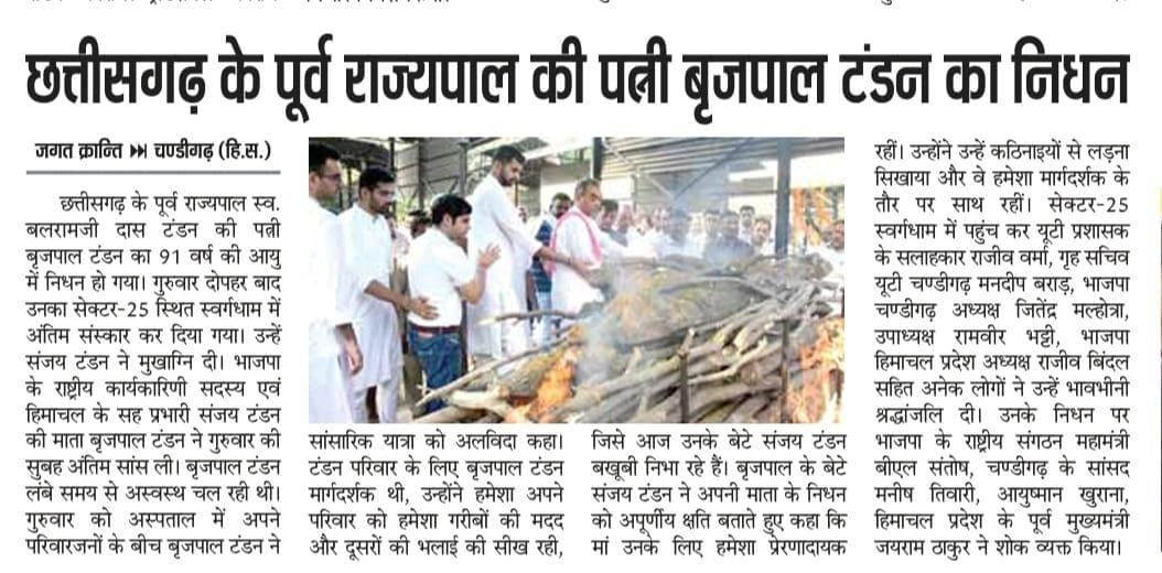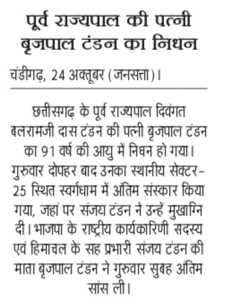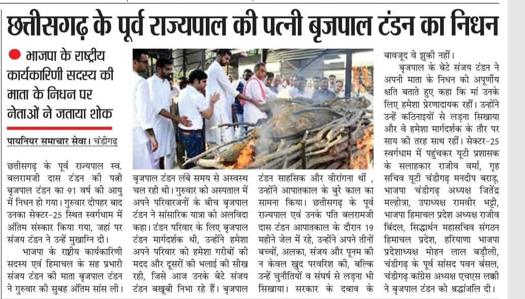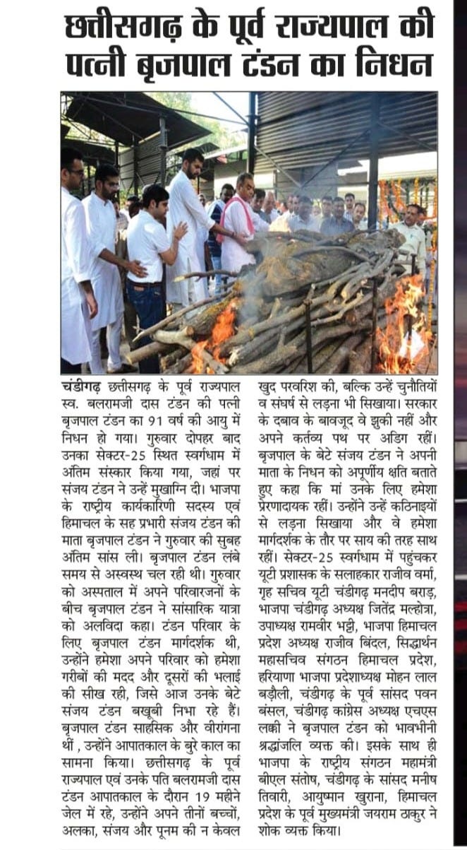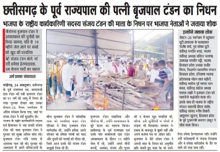 छत्तीसगढ़ के पूर्व राज्यपाल की पत्नी बृजपाल टंडन का निधन