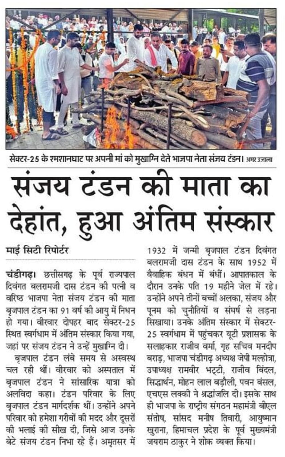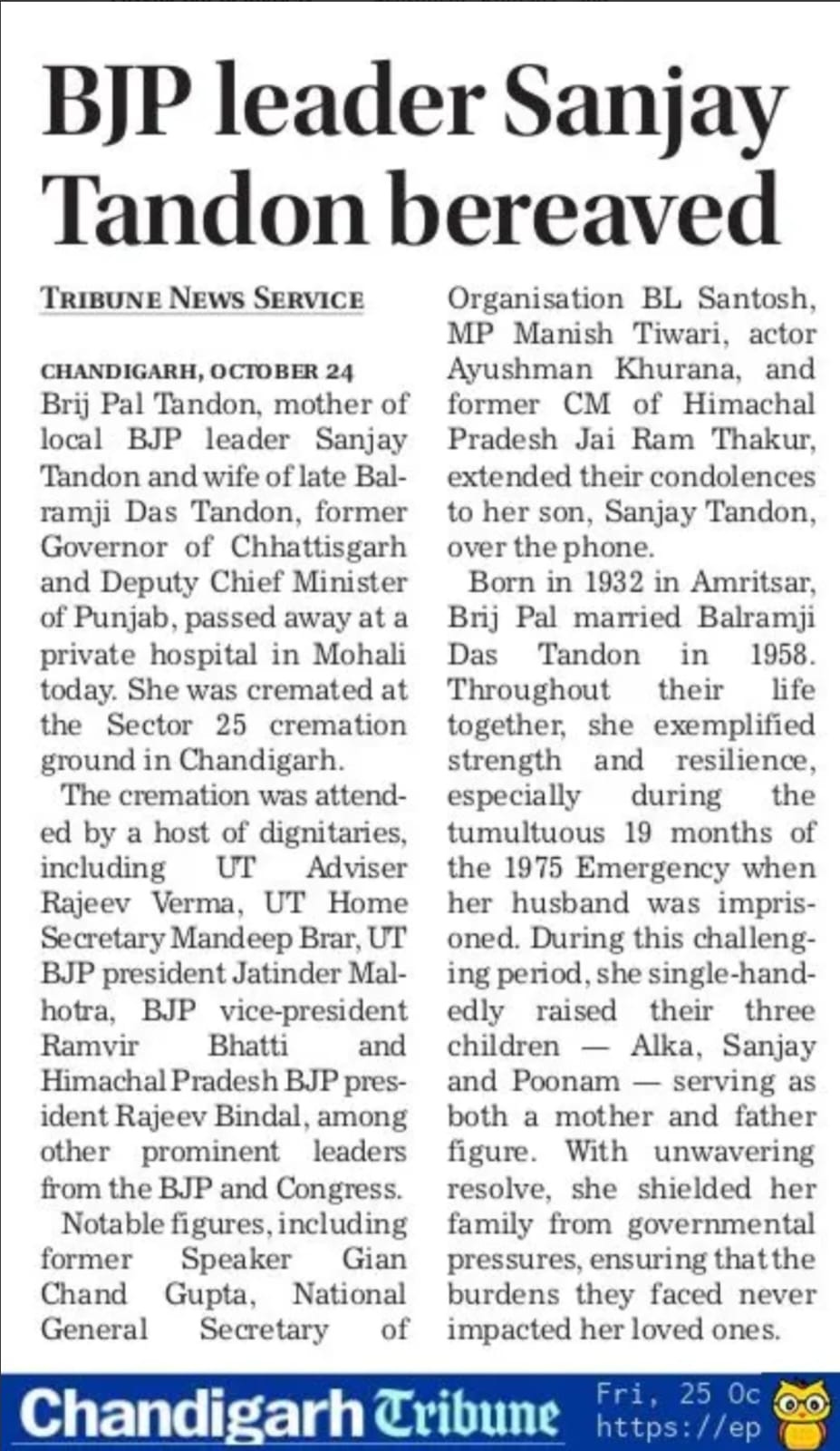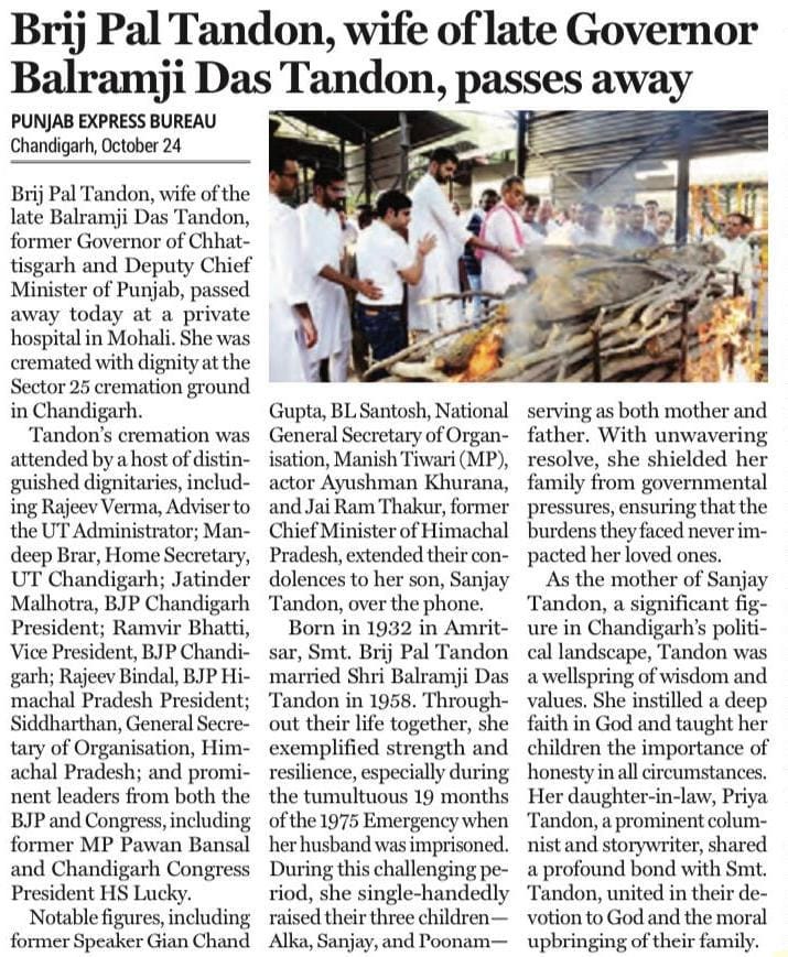 Brij Pal Tandon, wife of late Governor Balramji Das Tandon, passes away +7 more stories