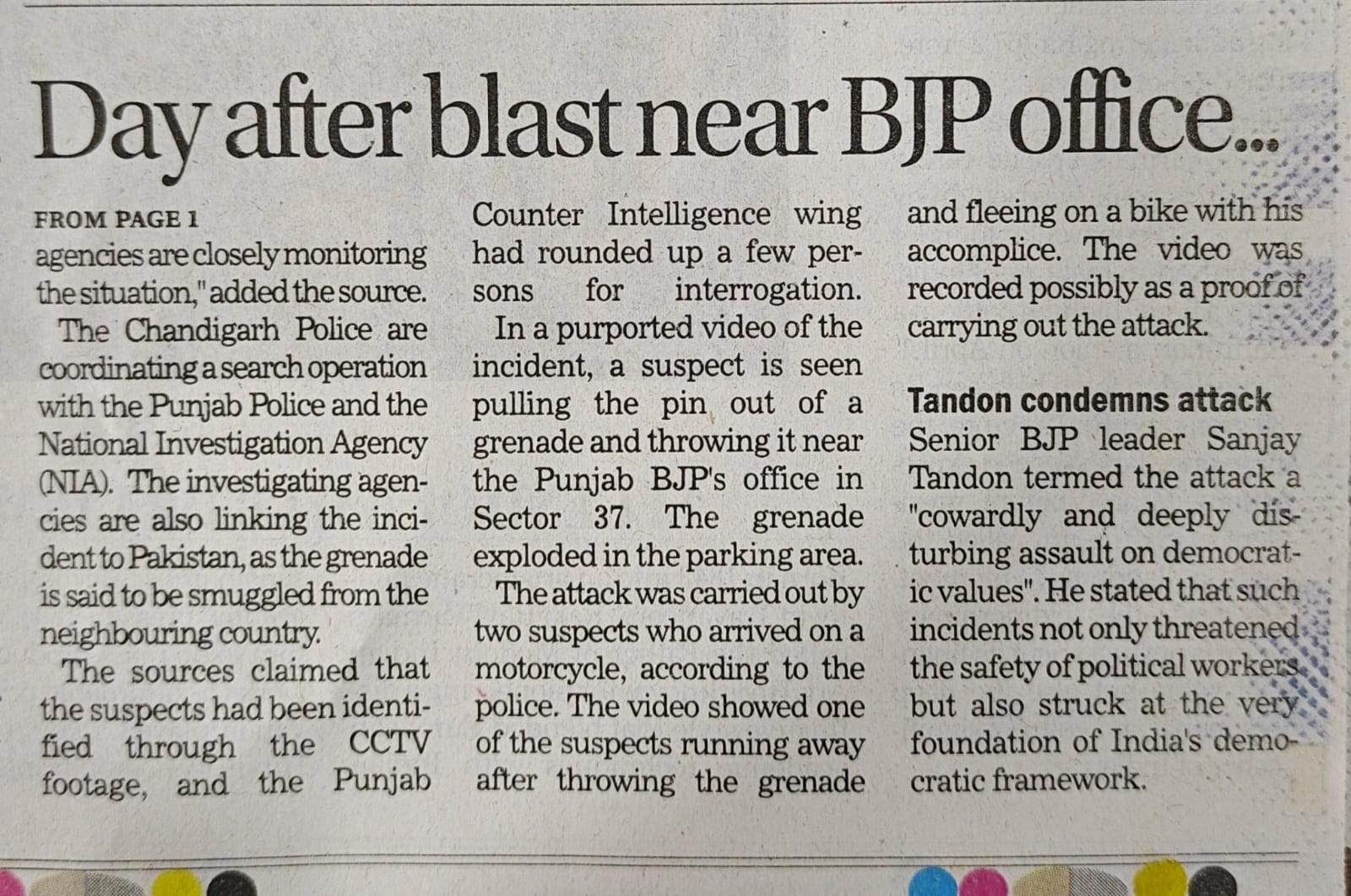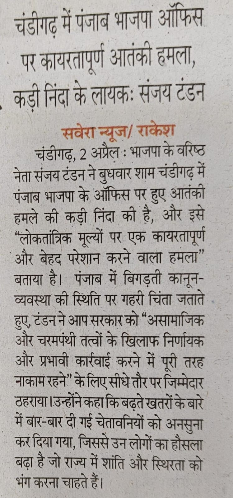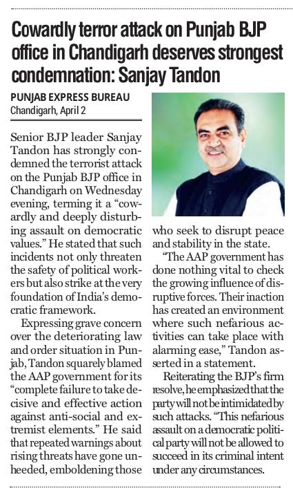 Cowardly terror attack on Punjab BJP office in Chandigarh deserves strongest condemnation: Sanjay Tandon +5 more storiesTeam Sanjay TandonApr 03, 2026ShareCowardly terror attack on Punjab BJP office in Chandigarh deserves strongest condemnation: Sanjay Tandon Cowardly terror attack on Punjab BJP office in Chandigarh deserves strongest condemnation: Sanjay TandonCowardly terror attack on Punjab BJP office in Chandigarh deserves strongest condemnation: Sanjay TandonPrevious