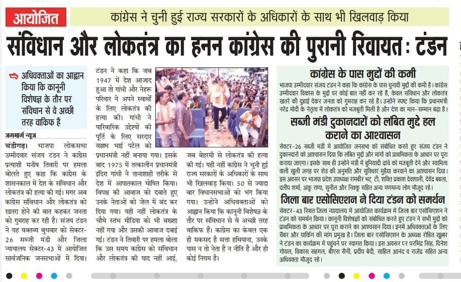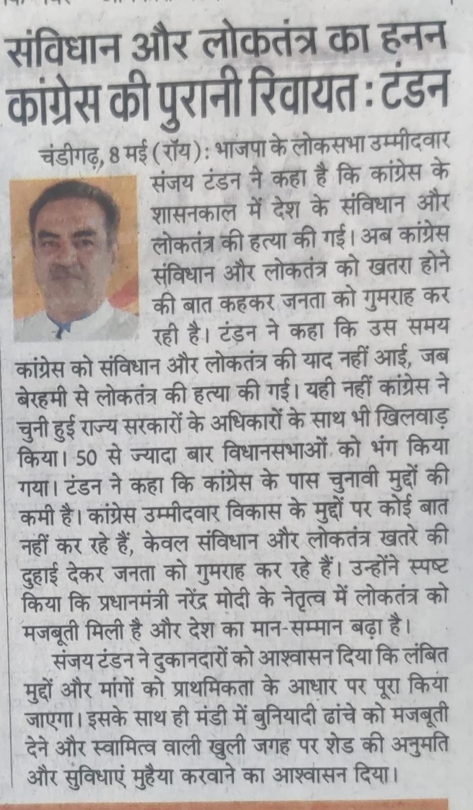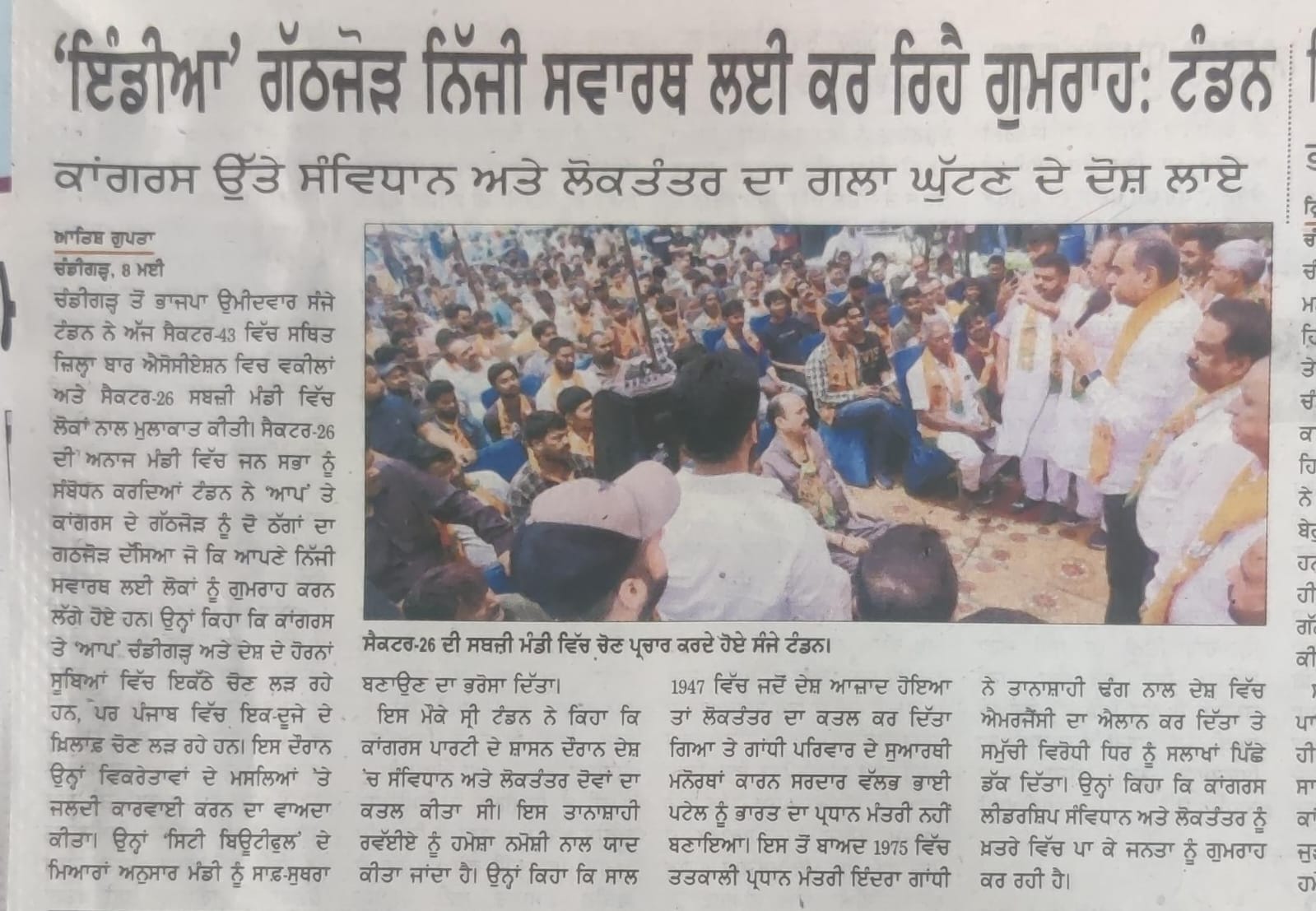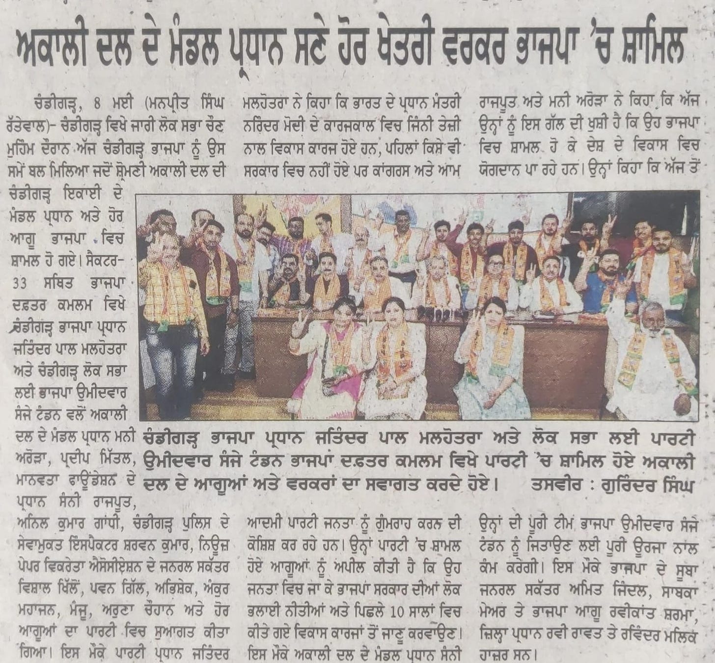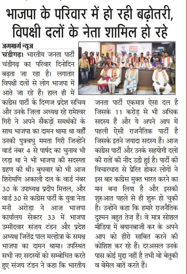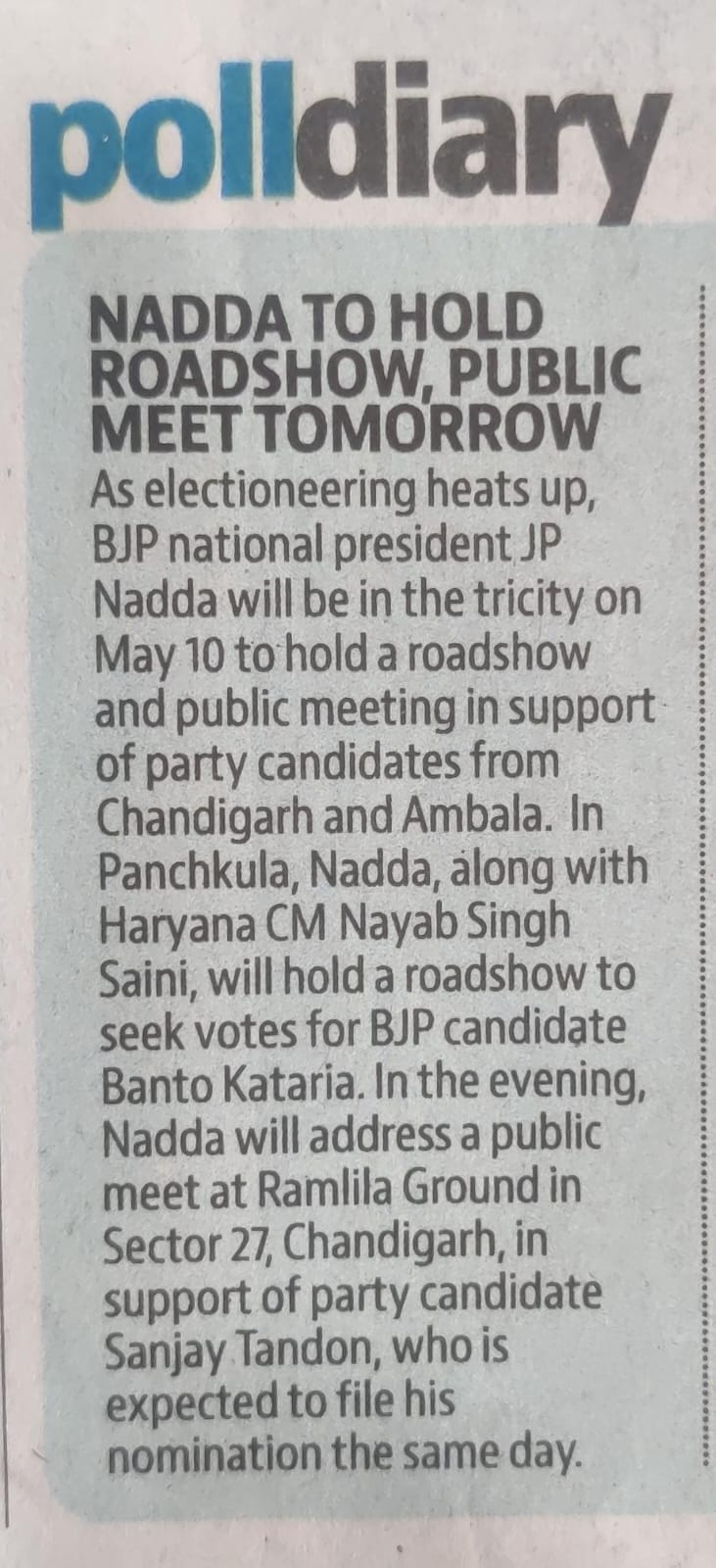चंडीगढ़ में 10 मई को जेपी नड्डा की रैली:BJP कैंडिडेट संजय टंडन के नामांकन में शामिल होंगे राष्ट्रीय अध्यक्ष, होगा हवन पूजन
