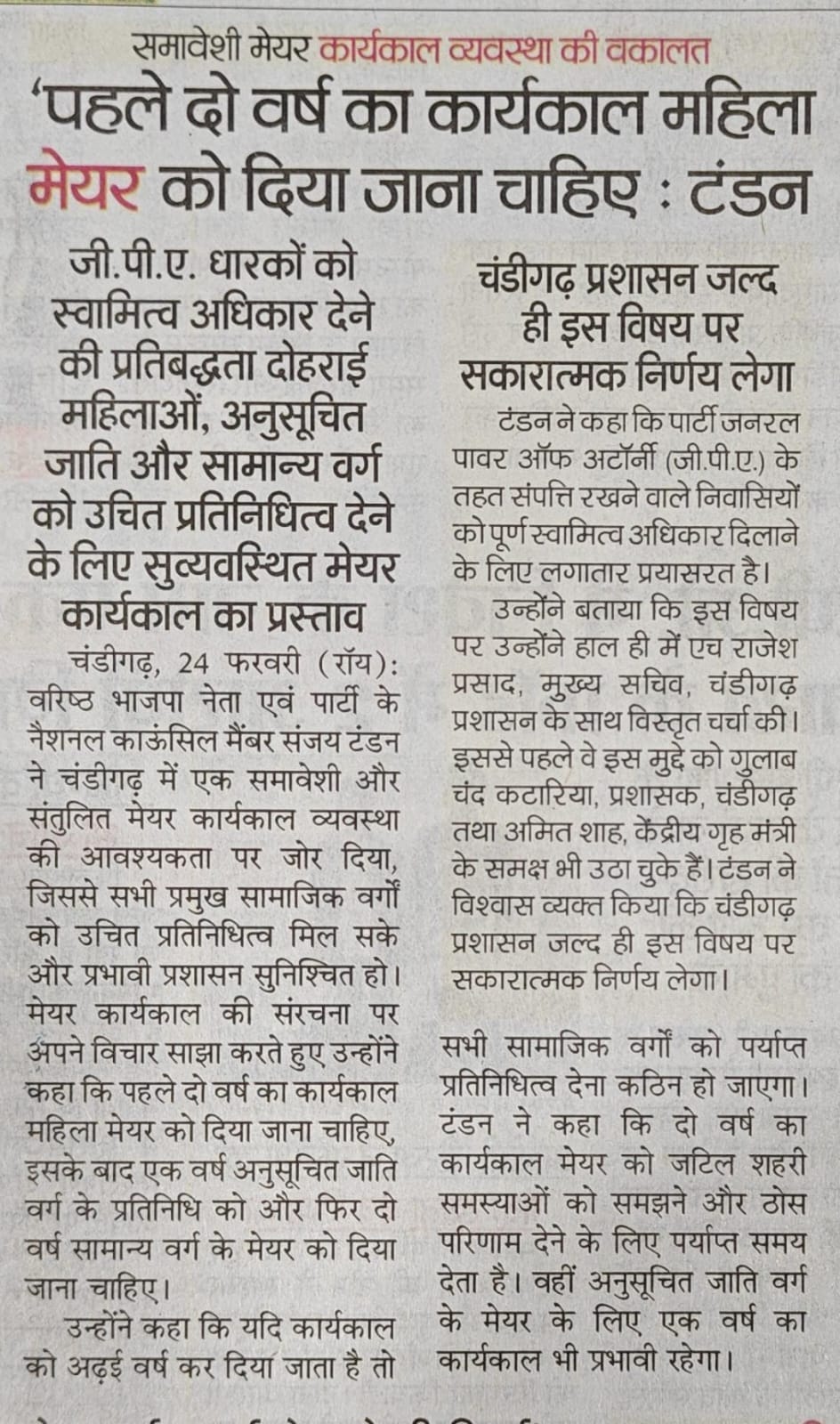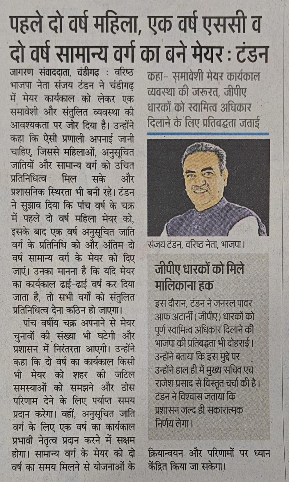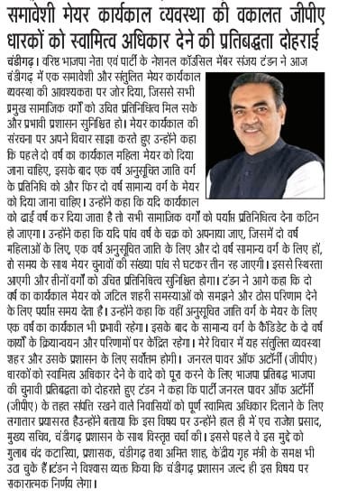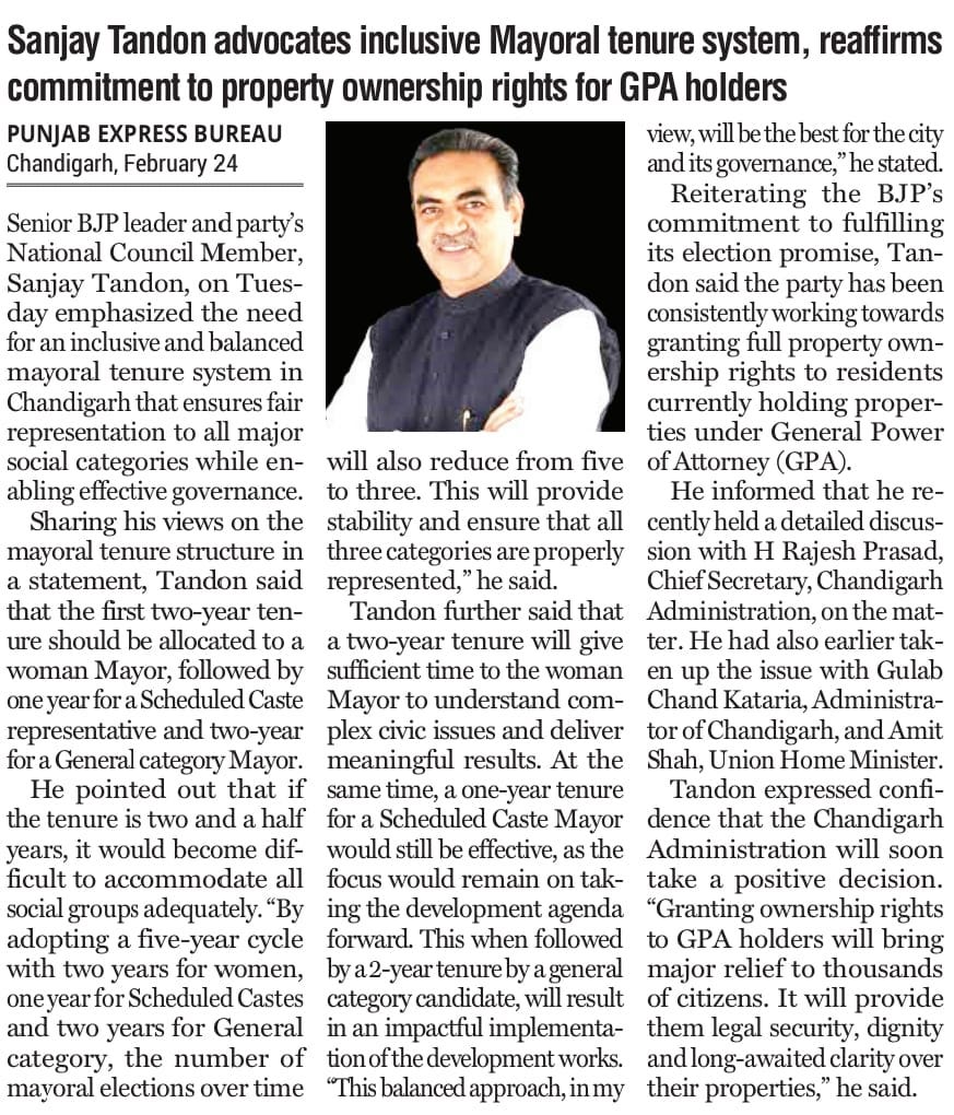 Sanjay Tandon advocates inclusive Mayoral tenure system, reaffirms commitment to property ownership rights for GPA holders +7 more storiesTeam Sanjay TandonFeb 25, 2026ShareSanjay Tandon advocates inclusive Mayoral tenure system, reaffirms commitment to property ownership rights for GPA holdersTandon advocates an inclusive mayoral tenure system in ChandigarhPreviousNext