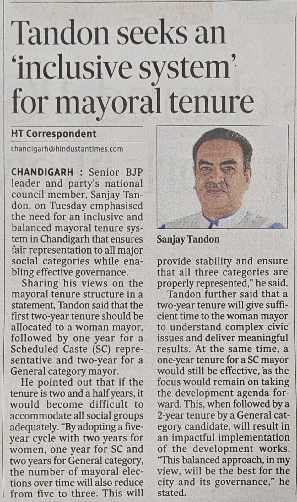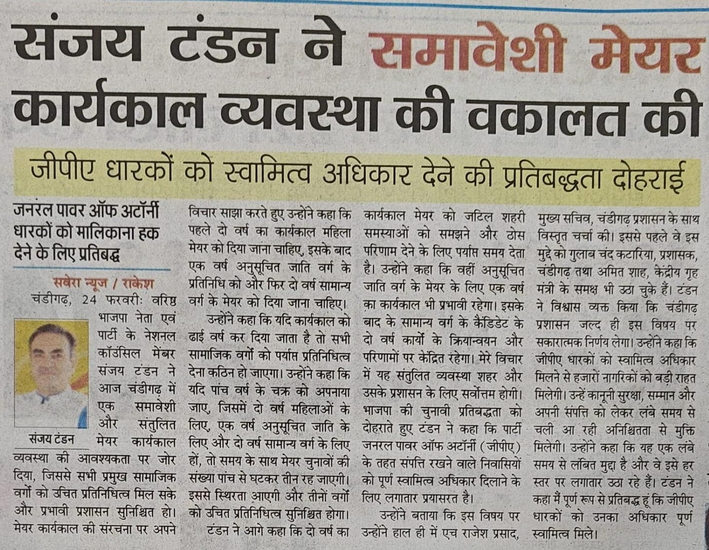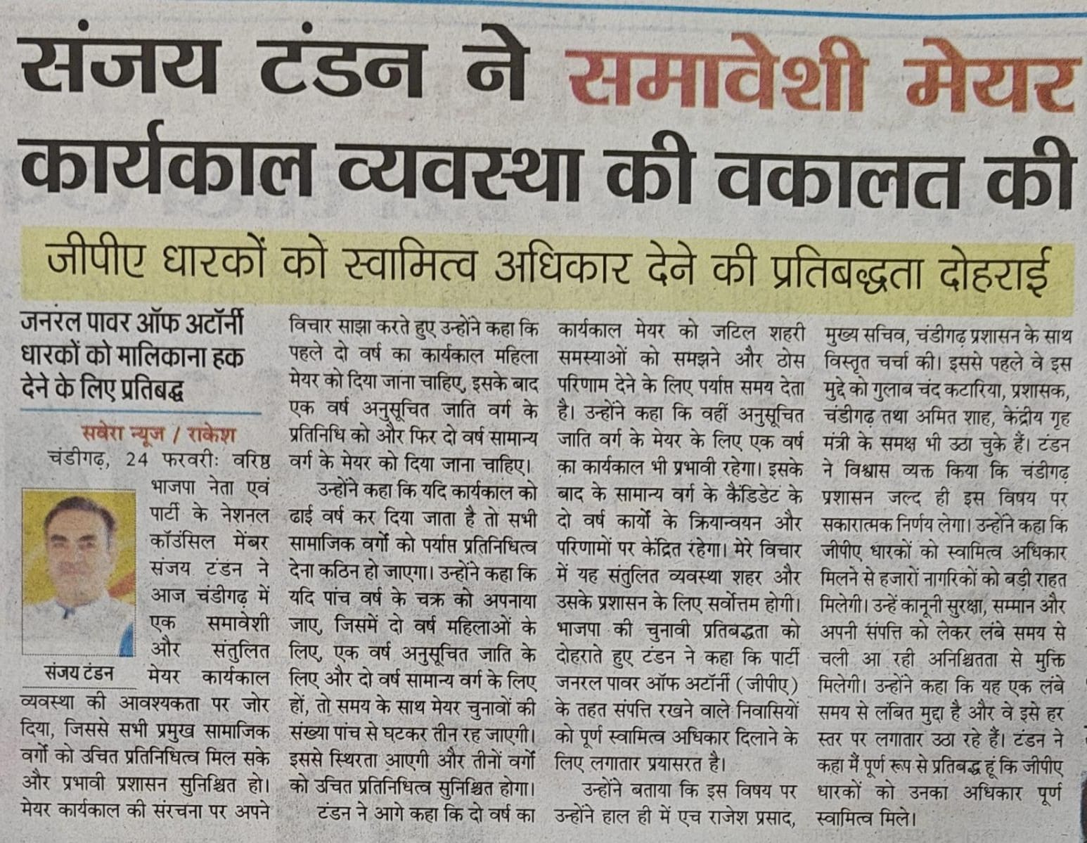 Sanjay Tandon advocates inclusive Mayoral tenure system, reaffirms commitment to property ownership rights for GPA holders +7 more storiesTeam Sanjay TandonFeb 25, 2026ShareSanjay Tandon advocates inclusive Mayoral tenure system, reaffirms commitment to property ownership rights for GPA holdersTandon advocates an inclusive mayoral tenure system in ChandigarhPreviousNext