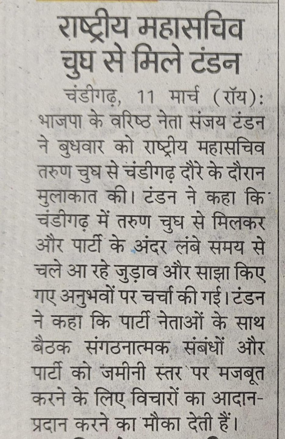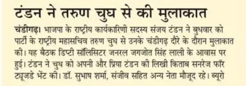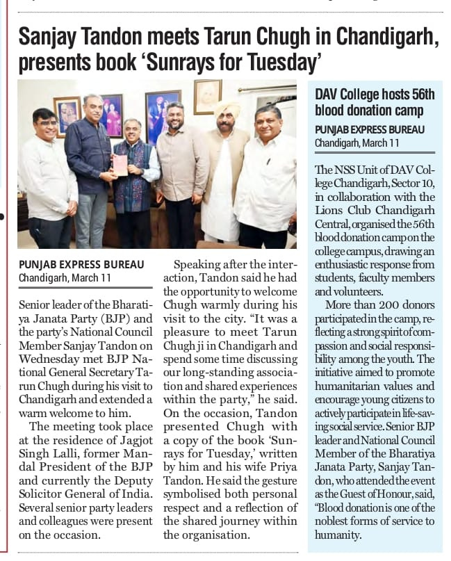 Sanjay Tandon meets Tarun Chugh in Chandigarh, presents book 'Sunrays for Tuesday' +6 more storiesTeam Sanjay TandonMar 12, 2026SharePreviousNext