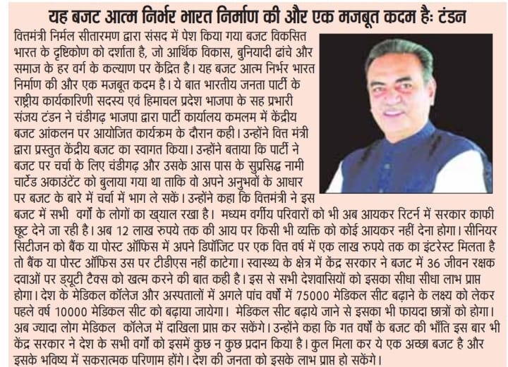 यह बजट आत्म निर्भर भारत निर्माण की और एक मजबूत कदम है: टंडन