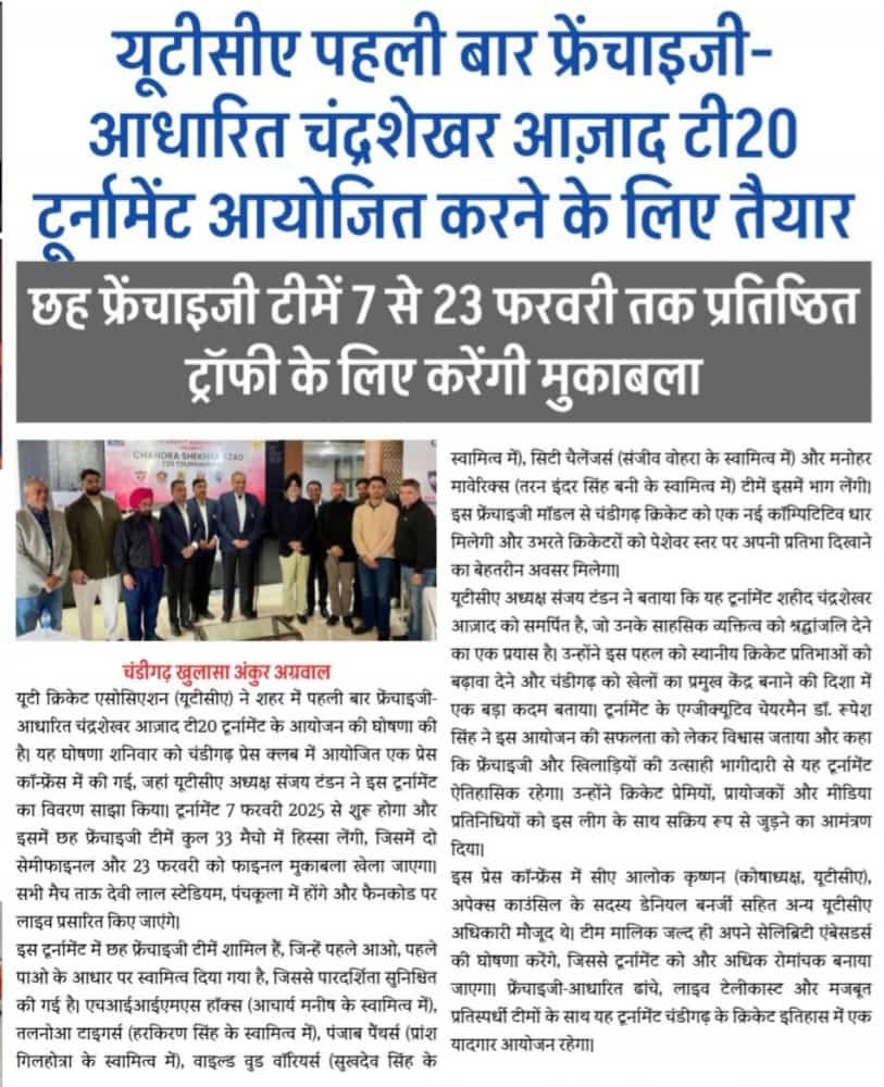 यूटीसीए पहली बार फ्रेंचाइजी- आधारित चंद्रशेखर आज़ाद टी20 टूर्नामेंट आयोजित करने के लिए तैयार